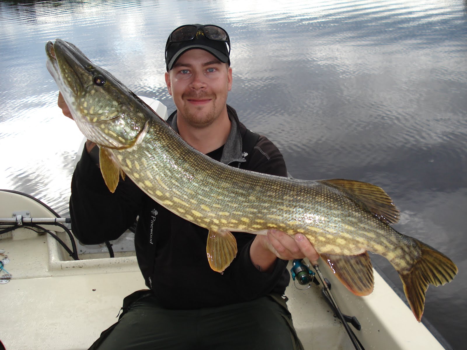 Det blev en ganska bra eftermiddagstur,knappa tio gäddor men med en bra medelvikt toppar på 8,5kg 105cm och 7,7kg 101cm får väl räknas som bra med tanke på åska o regn,jag och Andreas var ganska nöjda när vi åkte hemmåt i solnedgången sverige är ett härligt land med sina årstider skulle inte överleva utan dom !! På bild Andreas med fin gädda strax under metern och undertecknad med en mindre gädda !! Skitfiske och "Bänd Hårt Nicke"