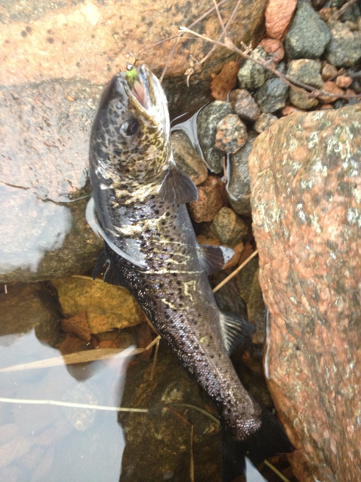 Sedan så fick jag en liten öring till men den va väldigt liten den.. Sedan kom sten och kollade lite då flyttade vi oss till ett annat ställe och där högg det direkt men jag fick inte fast dem. Rätt som det var som så högg det hårdare det gungade sedan några gung för att sedan släppa, När jag sedan vevar in så ser jag att något sitter på flugan, jag tar upp och granskar och ser det otroliga! jag hade lyckats dragit bort mungipan på en fisk .. Jag kan inte själv fatta hur det gick till men det hände... Vi jämförde den med fisken på föregående bilden och flärpen jag fick upp va större än på fisken jag tog. Knepigt hur det kan bli, stackars fisk som simmar där utan mungipa, men men vad ska man göra.