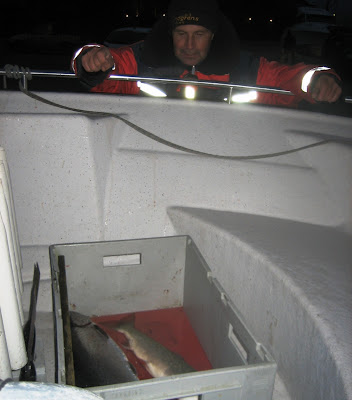 Efter en knapp timme kom de första två huggen vilket resulterade i en mindre Röding (48 cm) och en Lax på 51. Ingen av dem lovliga alltså... synd, jag hade spetsat på en rökfisk såhär innan jul.