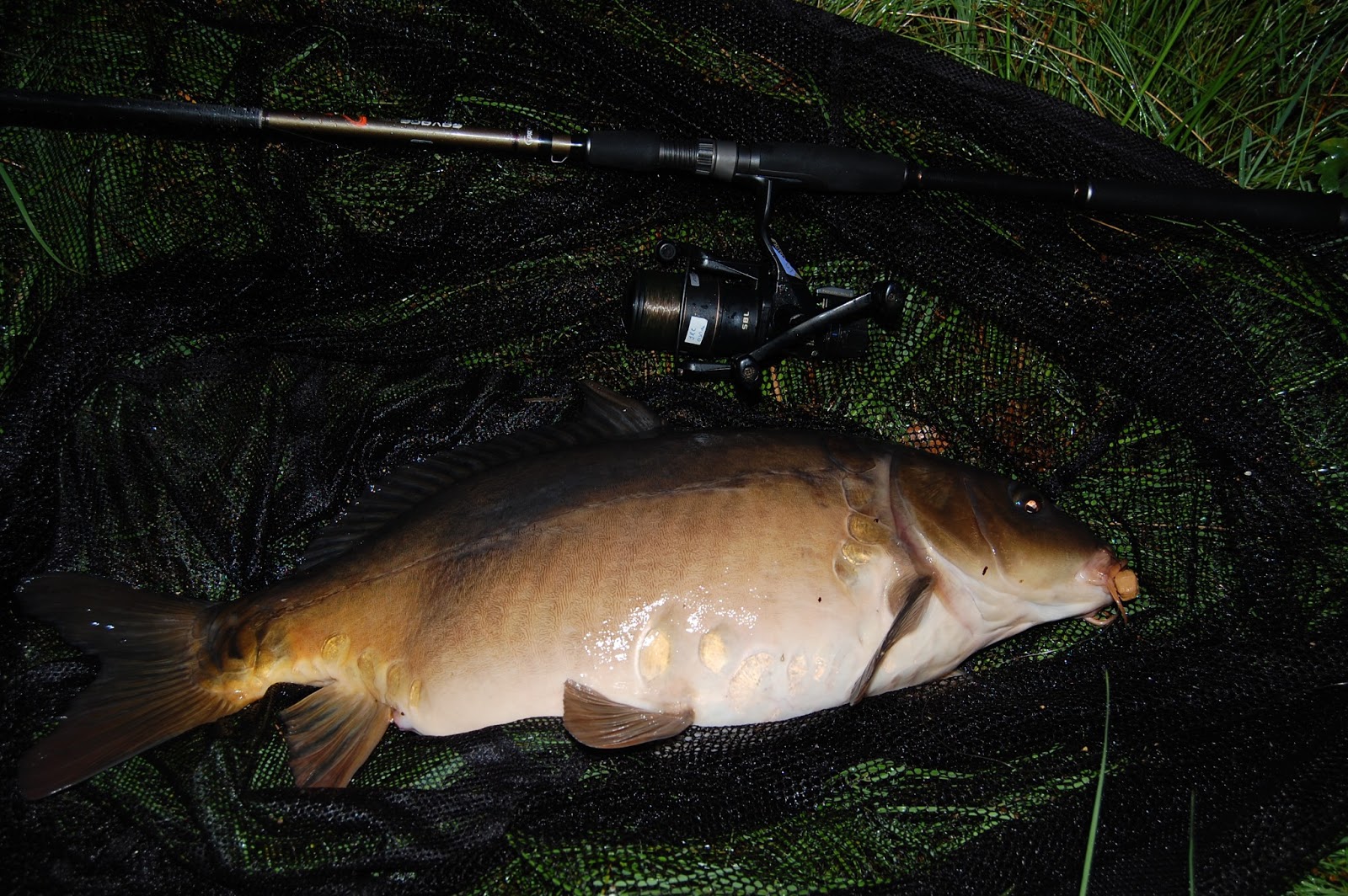 Här en annan kväll för några år sen, inte en ända karp gick upp på mina beten under hela dagen, men sent på kvällen, gick dem besärka gång över mina beten och det var inte svårt att lura in dem blanda växterna under spötoppen.