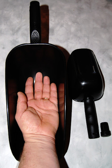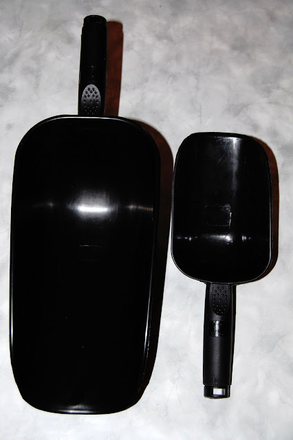 Här ses djupet i dessa skopor och det rör sig om en stark plastskopa, som håller riktigt bra. Den lilla modellen är perfekt att blanda spodmix med, skicka ut lite pellets med nära land, mata Slynan, eller låna ut som bestick, om någon skulle ha glömt skeden hemma o s v.