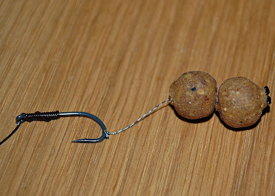 Här den färdiga riggen, som du ser, så skulle det få rum en boilie till av samma storlek mellan kroken och dem två boilies, men så här är det perfekt ...