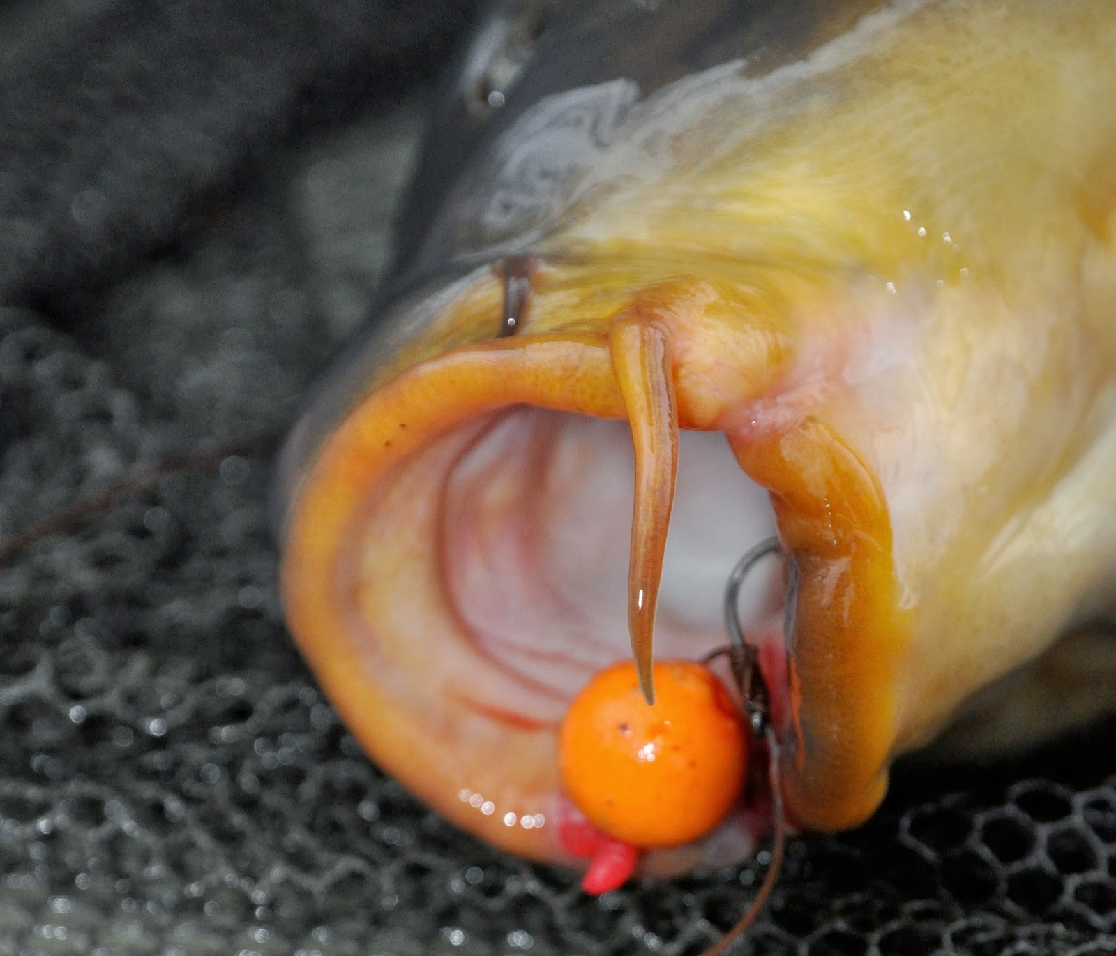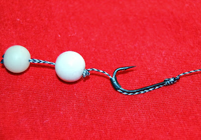 ... riggen fungerar väldigt bra, då den till 90 % sitter mitt i underköken på karpen, här är samma rigg, dock med den röda fakemaggot som hairstopp, jag fiskar ibland med och utan dessa gummi imitationer.