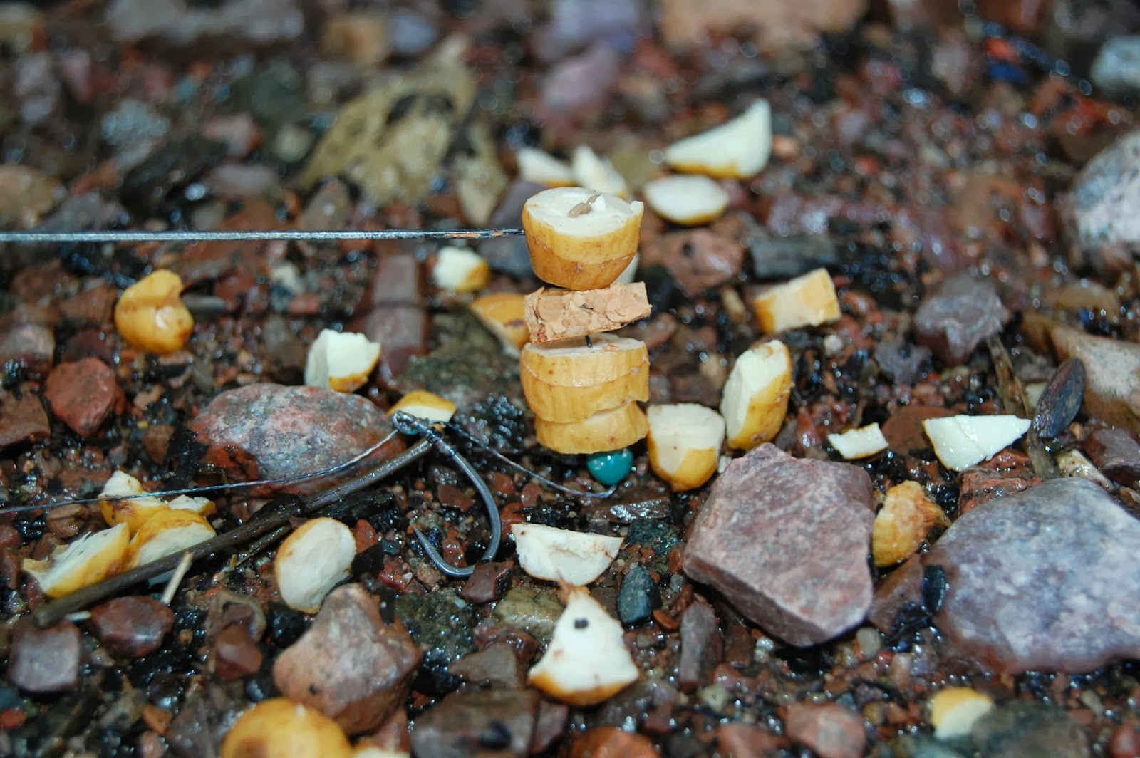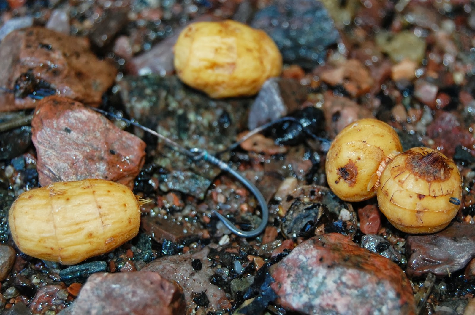 ... numera sedan 20 år sen, så skalar jag alltid bort lite av skalet och doften sprider sig snabbare, lite mer synlighet genom det vita köttet och sötman, mjölken i betet kommer ut och drar ner karpen till just krokbetet.
