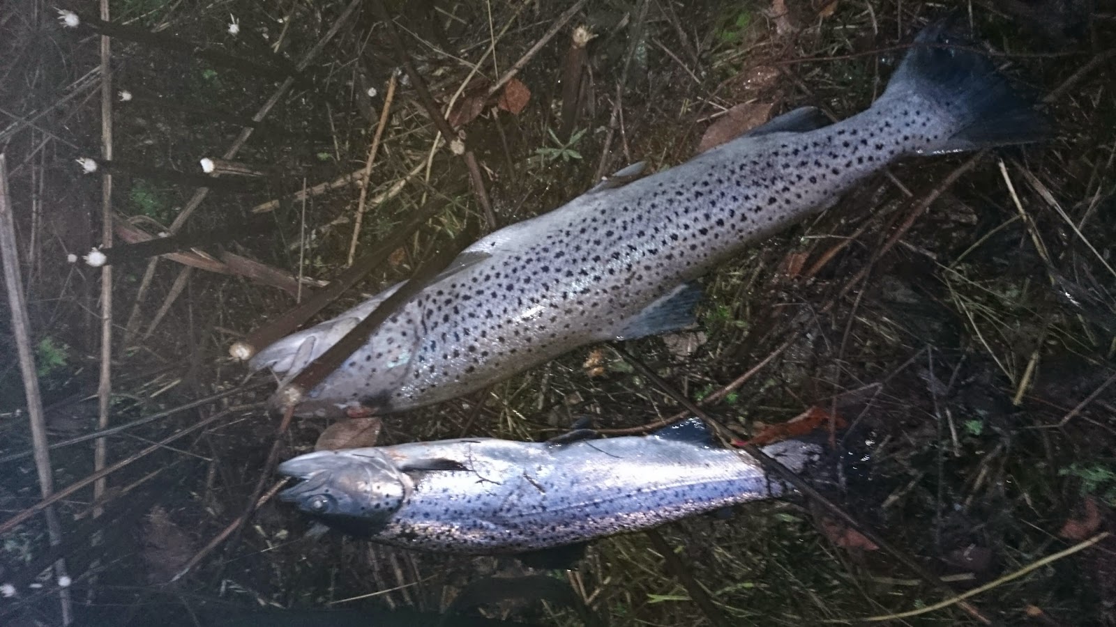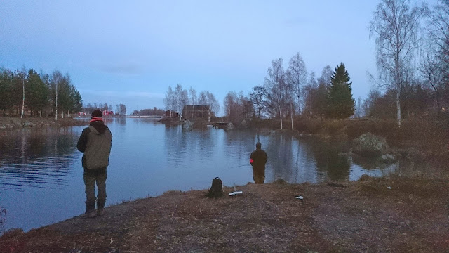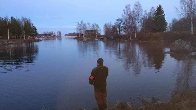 Åkte ner en liten stund efter skolan och flugfiska. Janne var på plats och hade fått tre öringar en godkänd. Men när jag börja fiska var det trögt hände inget. Sen börja det vaka lite och då fick jag en liten lax på 1.5 sen kände jag lite fisk men fick inte fast dom men en stund senare fick jag fast en den vägde 1.3 bägge fick simma tillbaka. Sen på andra sidan ser man att Janne får på en en öring på 2.3. Sedan kände jag mycket fisk men fick inte fast dom. Flink var också där och han tappa fisk och Janne tappa fisk sen packa jag ihop.