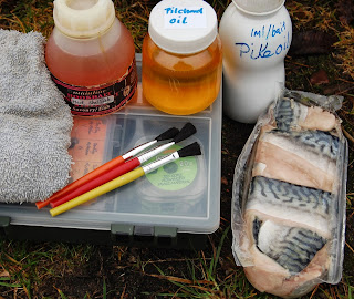 Även dina fiskbitar, som här på bilden är makrillfiléer i en paket, ganska ur vattnade människoföda, men med lite olja eller flavours, som du penslar på, så kommer doften att öka attraktionen hos dessa bitar, som du sedan mera monterar på din Kebab - rigg.