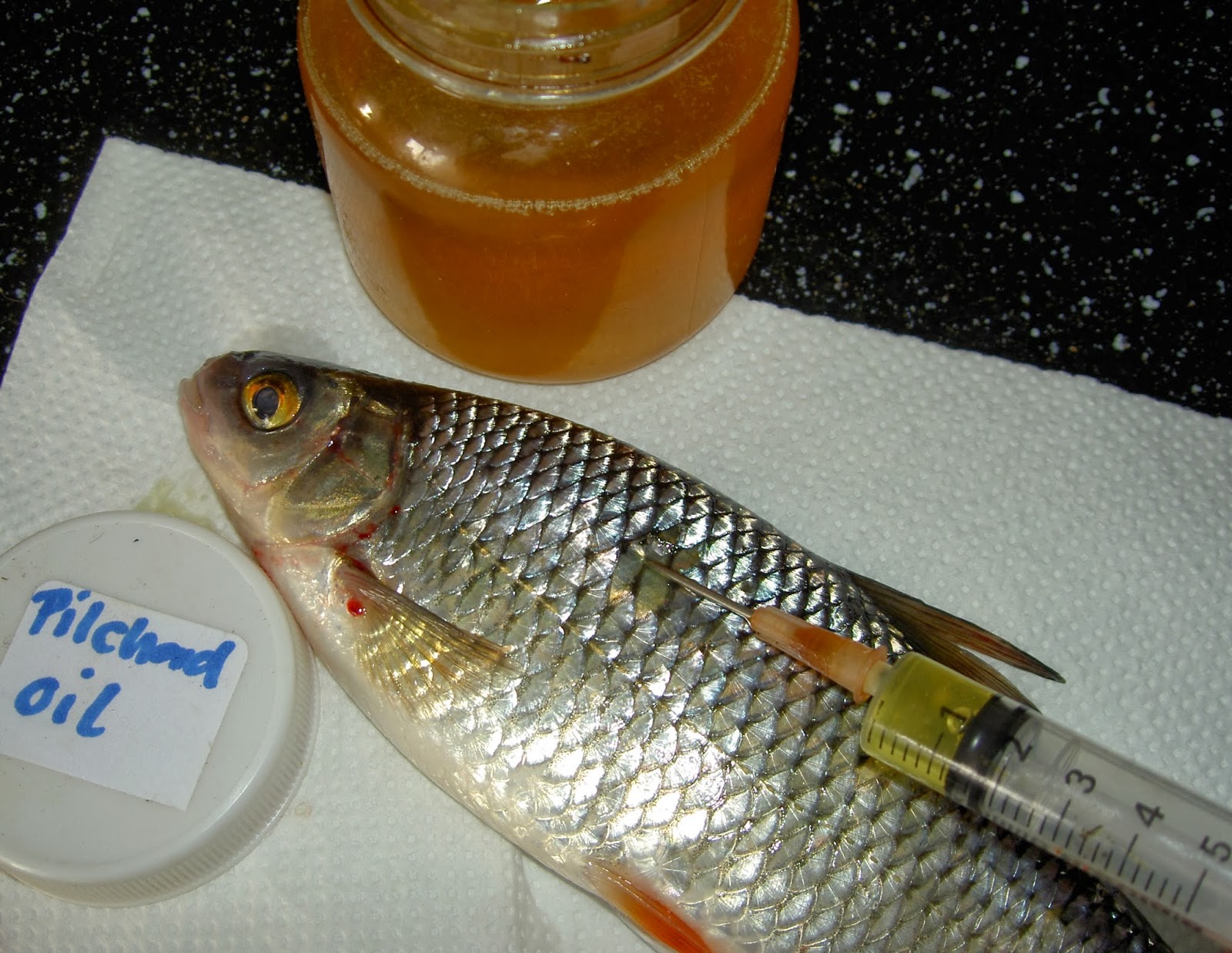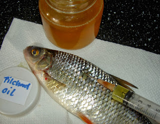 1 - 2 ml flavours eller 2 - 5 ml olja trycks i på flera ställen i den döda betesfisken och ibland trycker jag även ner en smal bit sittdyna i betesfiskens hals, som får den till att flyta upp.
