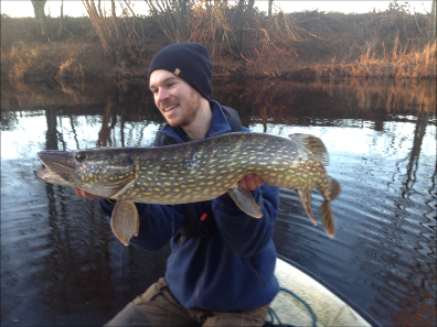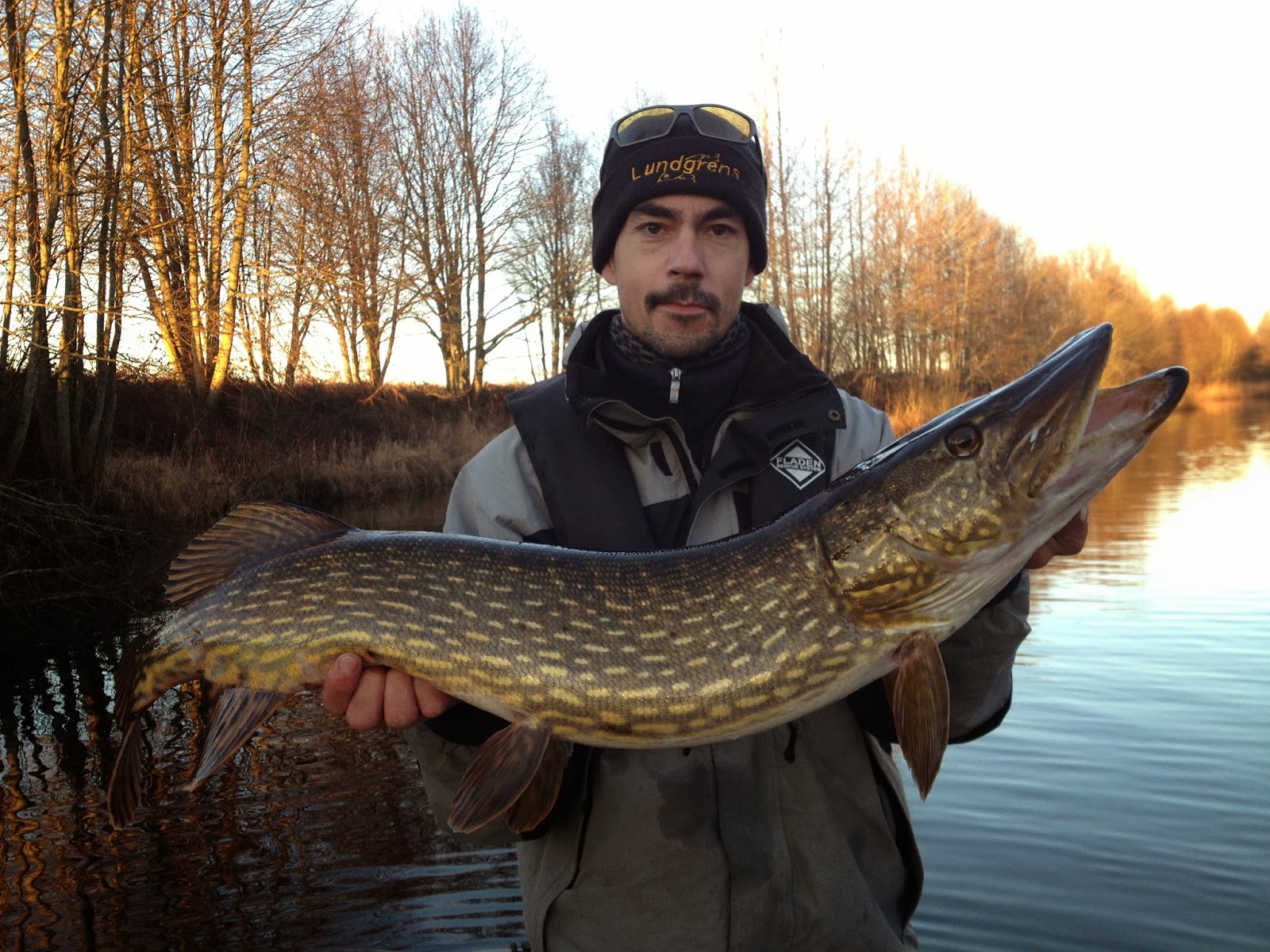 Gryningstimmarna passerar utan någon aktivitet men när vi kommer ner till en sträcka som brukar leverera hugg hettar det till. Vi ligger och driftar våra flöten nerströms samtidigt som vi kastar våra tailar och gummibeten. I ett kast mitt i åfåran suger det plötsligt till på mitt gummibete men jag lyckas inte kroka fisken. Kort därefter får jag ytterligare ett kraftigt hugg och den här gången sitter mothugget. En kämparglad strömgädda har inhalerat mitt bete och det är med frusna fingrar jag krokar loss betet innan jag återutsätter fisken som uppskattningsvis väger en bit över 5 kg.