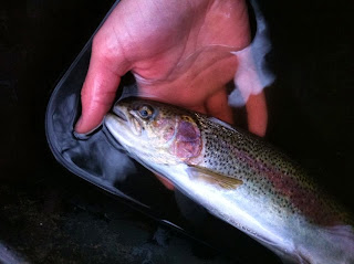 Det var en fisk i halvkilos klassen med en riktigt spetsig stjärtspole. Identisk med en vild regnbåge. Jag han dock aldrig knäppa några foto på den vilket var väldigt synd.