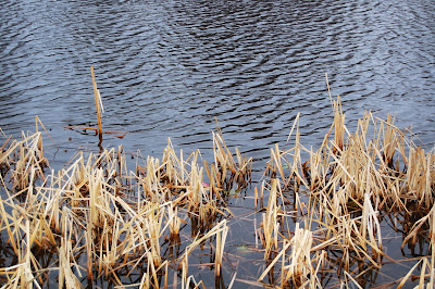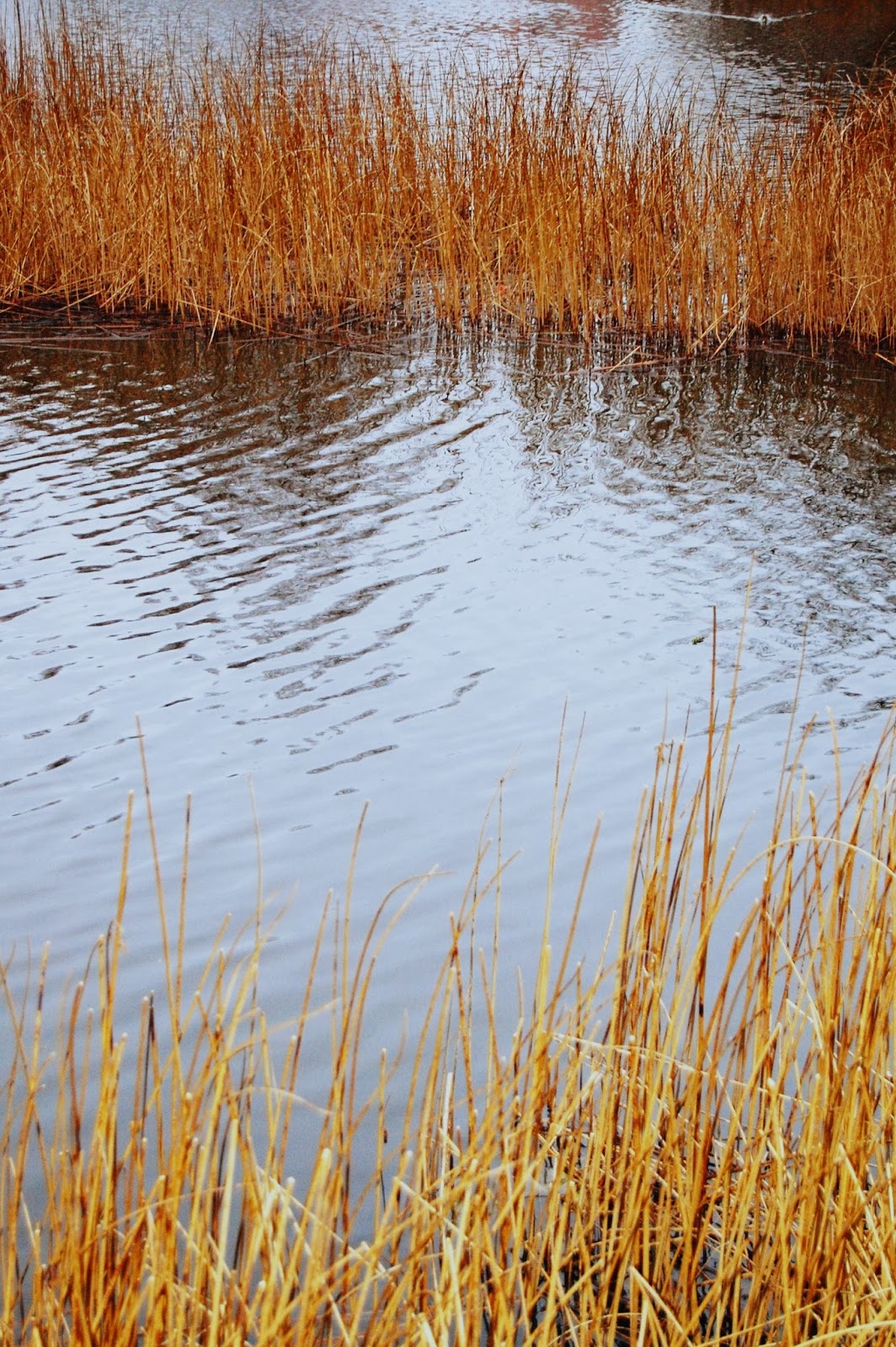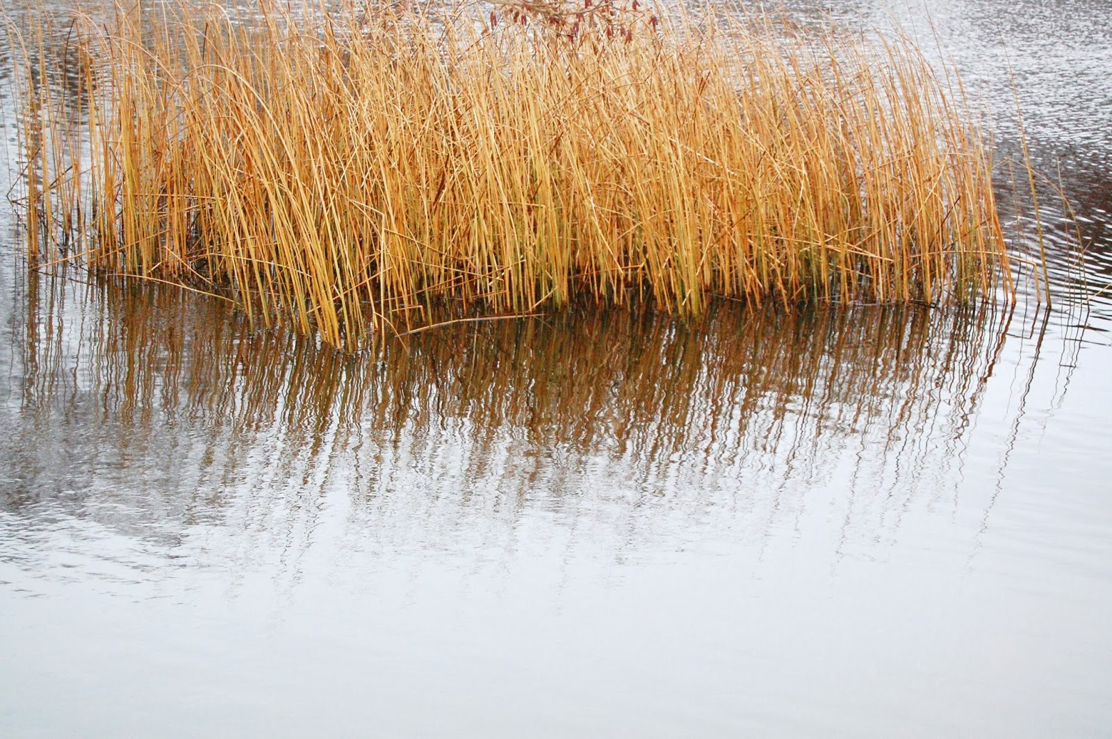 Tittar man överst i bilden, så ser man vindens tag på vattenytan och jämför det med hur lite vind, som träffar vattenytan mellan vassarna, det finns lä och skydd.