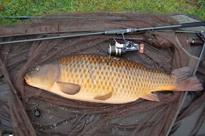 Jag fikar lite och gör lite nya crumb - bags och sen drar det iväg rejält på spöet som står på Udden 5 meter bort och jag är på spöt snabbt och känner att det är en karp till och det blir lite problem att pressa den över branten jag fiskade på.