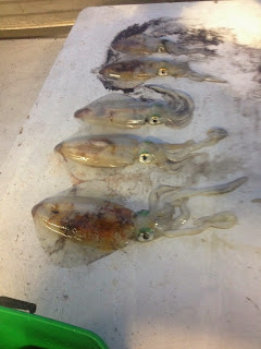 Vi fångade några rätt stora squids under betesfiske i natt. Ser ut som riktiga rymdmonster när de kommer in i mäsket.