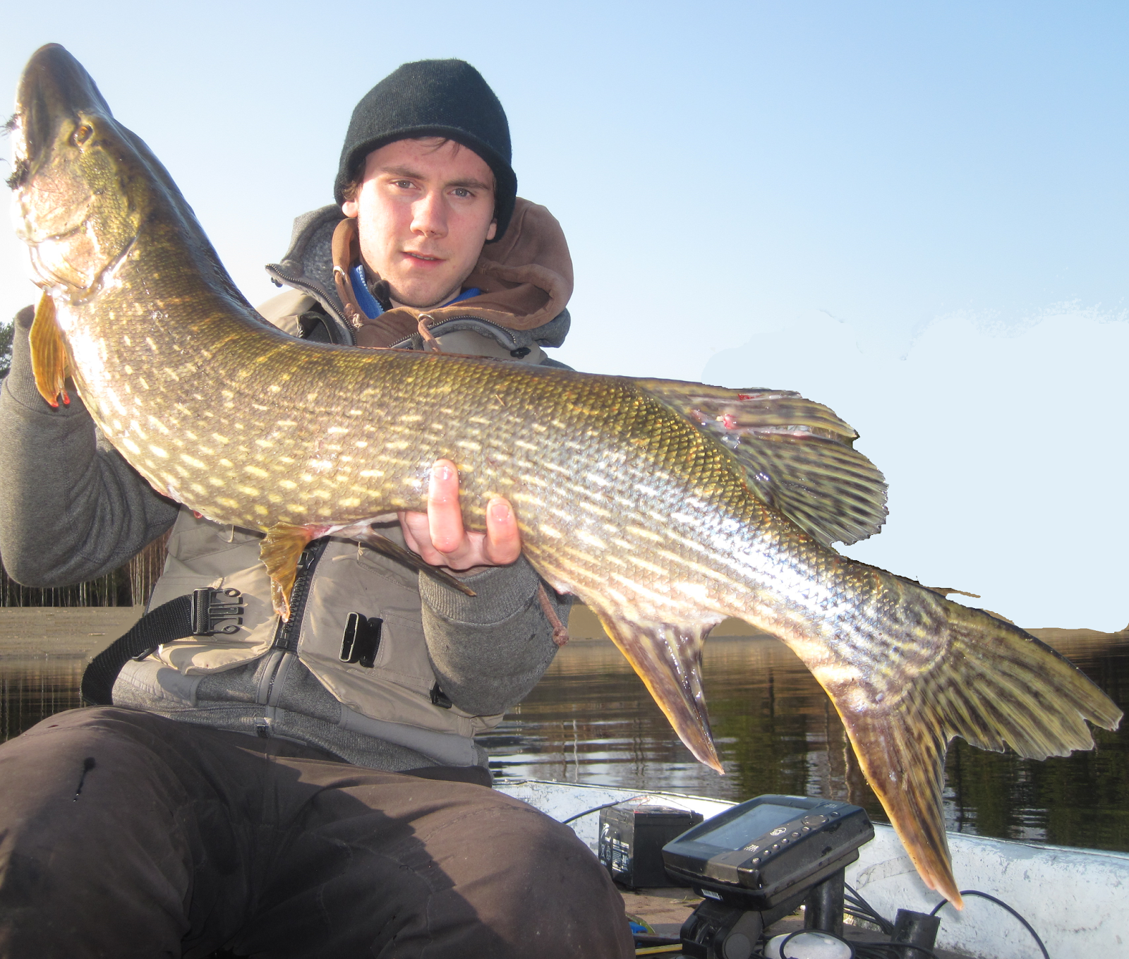Det eneste kjipe som skjedde på denne turen (hvis man ser bort i fra snagging på annenhvert innsveiv) var da jeg fant denne gjedda flytende med buken i været. Den var såvidt i live, men hadde masse luft i magen. Etter forgjeves å ha prøvd å klemme ut lufta, stakk jeg ett lite hull på den. Lufta forsvant, men fisken ble liggende på bunnen,. Gjedda var 116 cm lang og veide 10100 gram.