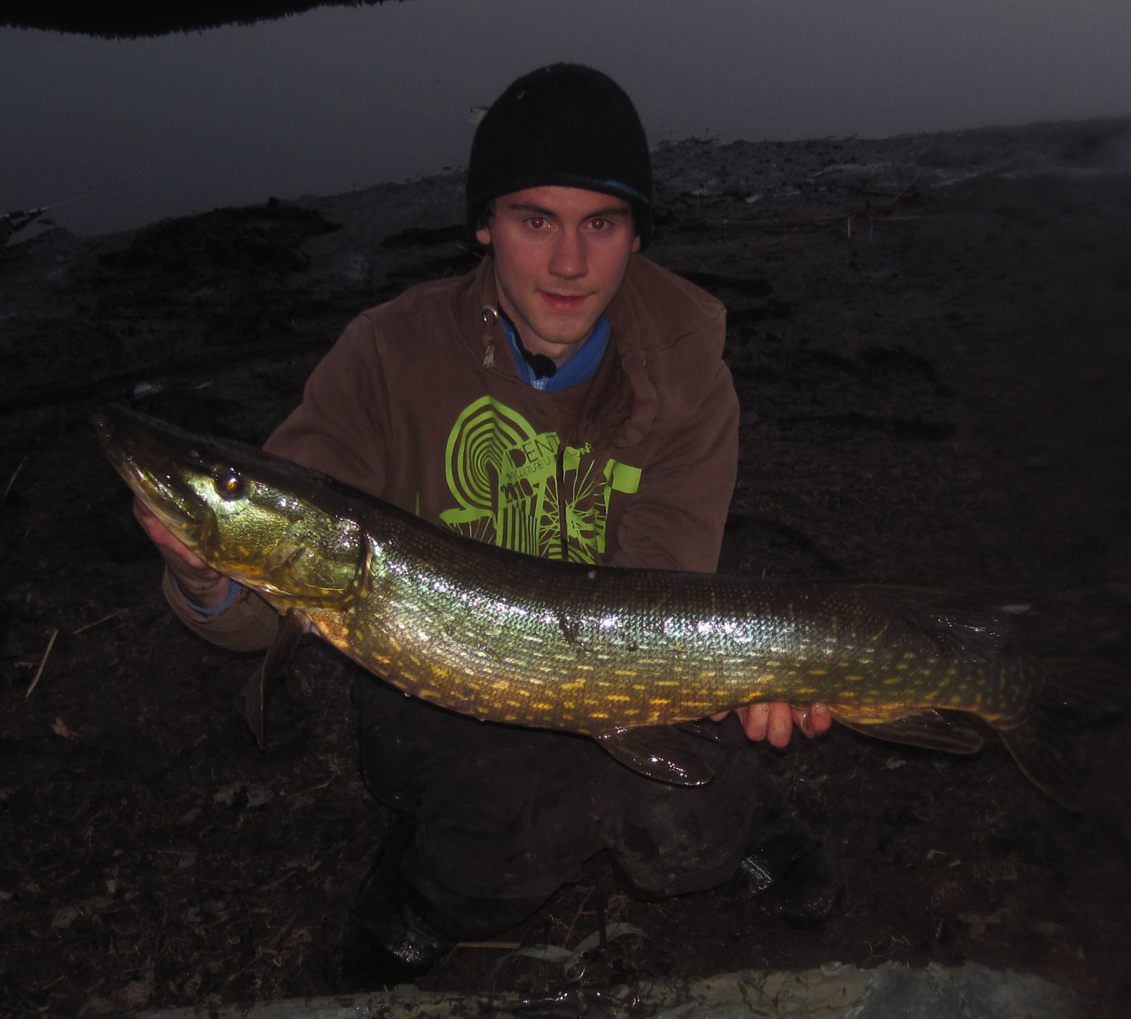 Da er jeg hjemme igjen etter en helg med gjeddefiske og godt selskap. Jeg hadde fri på fredag, så jeg stod opp tidlig for å lete opp områder med agnfisk, samt finne teltplass og samle litt ved. Ingar skulle komme etter utpå kvelden. Etter å ha spinnfiska hele dagen og fått to sniper og en femkilos, var jeg litt i tvil på om vi hadde valgt riktig plass. Det var jo tidlig enda, og slett ingen selvfølge at det er gjedde i området enda. Meitestengene ble likevel klargjort, og da Ingar omsider var på plass, ble tre siker kjørt ut på dypet. Jeg skulle akkurat til å jekke kveldens første halvliter da dagens første run kom i skumringstimen. Etter ett kjapt tilslag, svarer det relativt tungt i andre enden, og etter en morsom fight, lå det en grei fisk på matta!