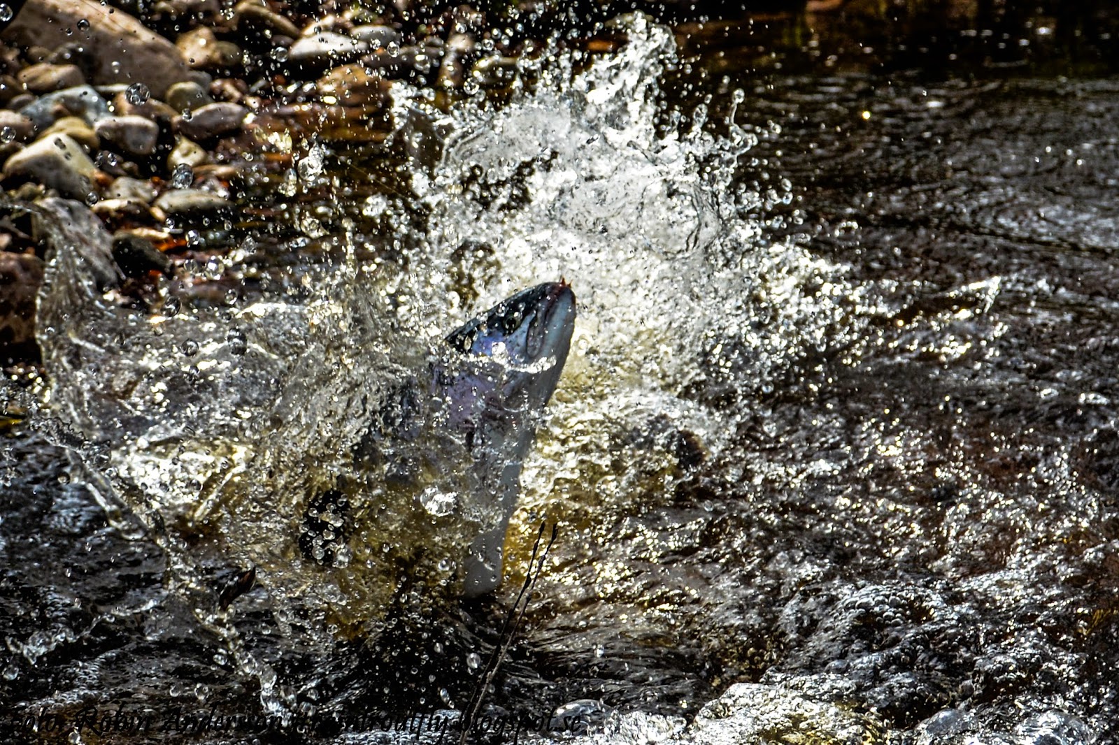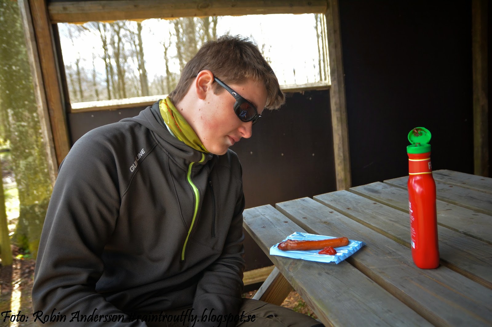 Dagen gick och även Robin kom in i matchen och landade en fin fisk på en, hör och häpna röd streamer, efter att gett bort sina ända orangea. Därefter var det lunch dags. Eftersom vi varken hade kol eller ved så fick det bli vad torra grenar vi kunde hitta runt om oss (inte det lättaste efter en hel dags regn) att få fyr på. När vi väl fått fyr med tändstål och grejor(tändare hade vi såklart inte med oss
