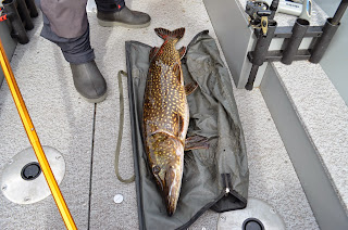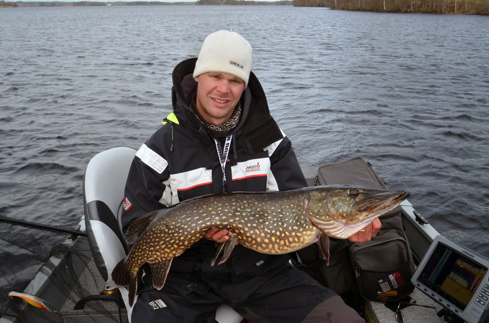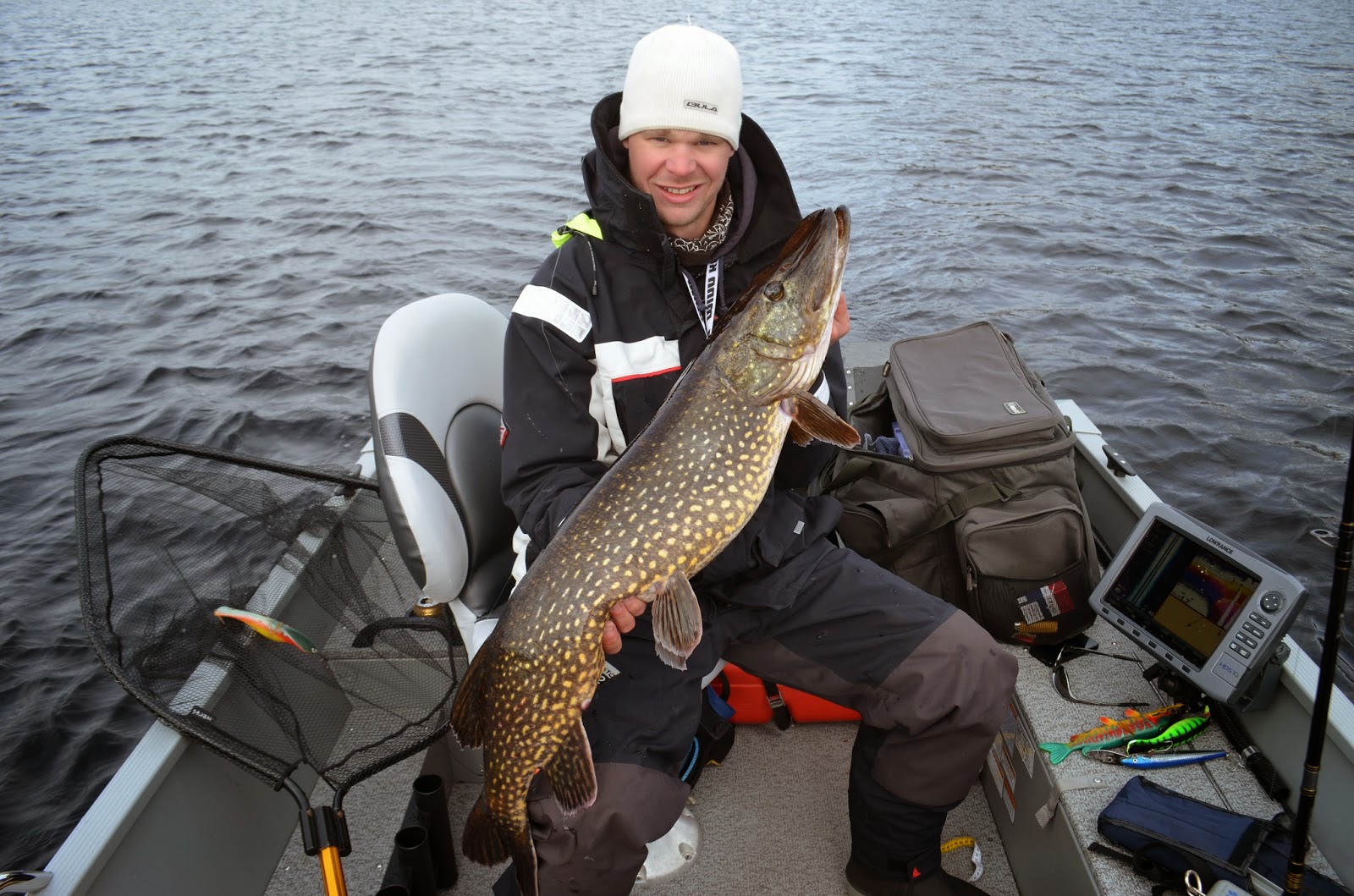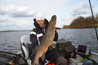 Vi möttes upp vid rampen vid sjutiden för att ge oss ut mot sjöns norra delar men gäddorna var som bortblåsta. Vi bytte lite områden och hittade lite fisk. Åsberg drog på ett bra hugg som tyvärr måste varit felkrokad då det kom upp en gädda runt 5 kg och storbesvikelse syntes i Åsberg ögon, men hans skulle komma igen längre fram under dagen. Vi får några ströfiskar av mindre modell innan vi byter till ett nytt område och Åssse smäller på ett hugg direkt men ser direkt att det är en mindre då nästa paravan tar tvärstopp och en lite bättre fisk har gapat över plasten. Efter en lugn och fin drill så ligger en bättre gädda i håven som väger in på 9 kg blankt.