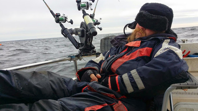 Precis fått i allt då passar kapten på att vila upp en lax för en gångs skull.