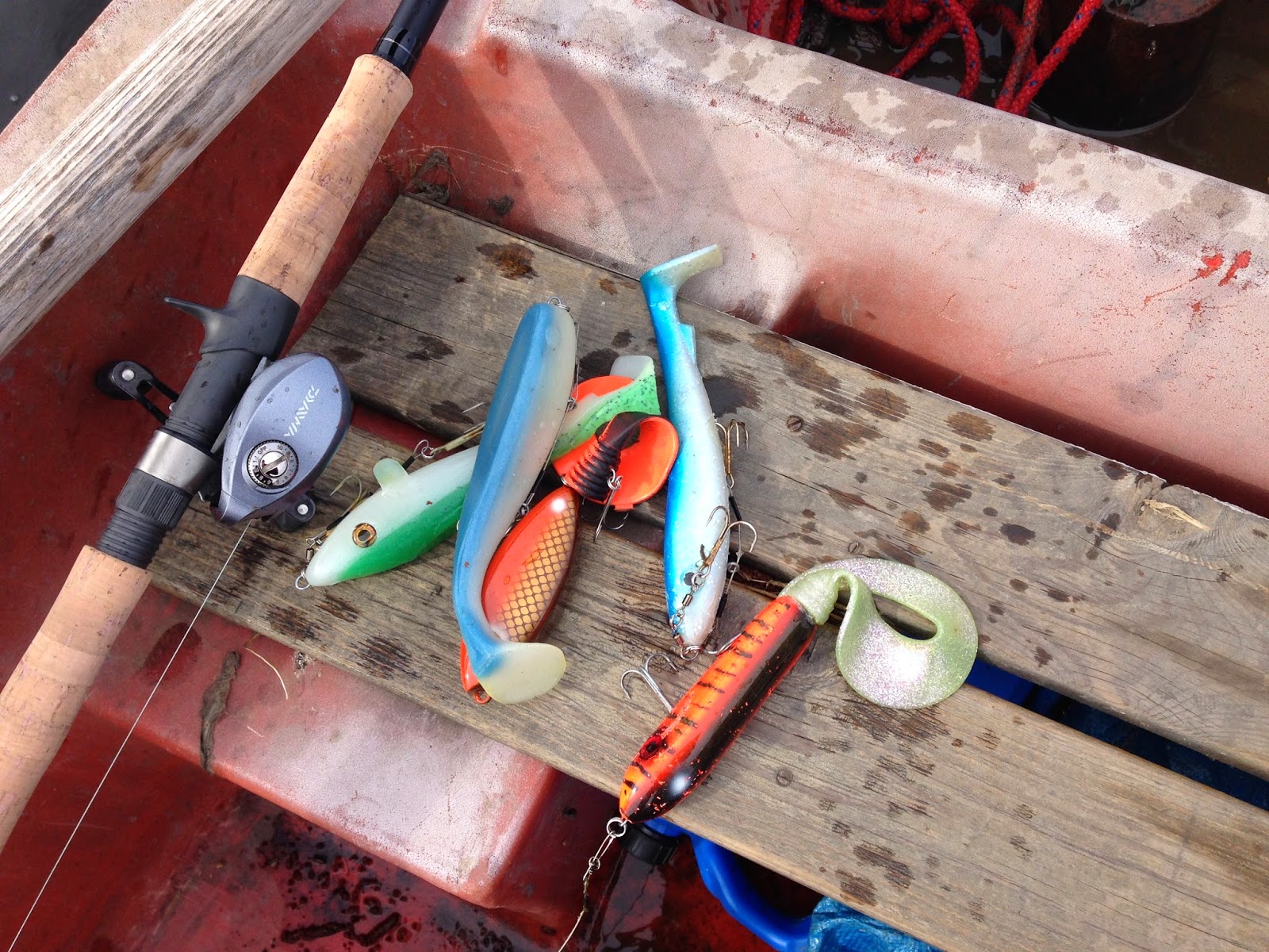 Jag började med shadar av olika slag, ett vinstbete från i lördags (den grön/vita på bilden nedan) samt ett testbete (den blå/vita Doffshaden från Anchorbaits).