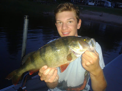 En heldag på sjön räckte tydligen inte för William så han tog med spöt och popperasken till bryggan. På andra kastet landade han en abborre som innebar nytt PB på 1,14 kg och 45 cm. Mellan mätning och vägning sumpade han den i håven, så när det var dags för återutsättning var det full fart o fisken. Sånt är jäkligt kul att se.....