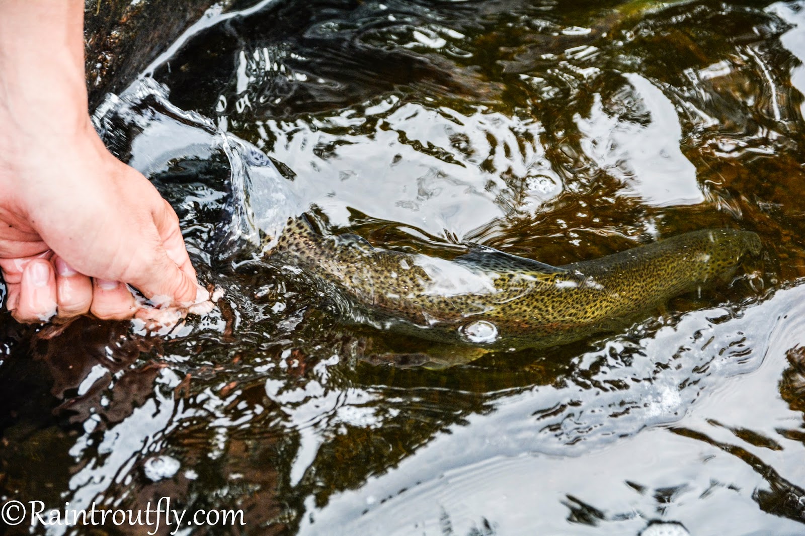 [FONT=Arial]Resan upp gick smärtfritt och fisket började riktigt bra. Första bågen landades längst upp på sträckan vid odlingen redan efter ca 30 min. Nu kände vi att den tidiga morgonen hade gett utdelning och att vi nu hade en hel dags fiske med hyfsade förhållande framför oss gjorde inte saken värre. Vi fångade 4-5 regnbågar mellan odlingen och bron innan vi körde nedströms en bit.Vädret var lite växlande med stundtals lite sol men även några riktiga regnskurar. Det påverkade däremot endast fisket positivt och under dagen hade vi jämnt och bra fiske med både streamers och nymfer.Med få vak så kändes inte torrflugefisket så hett men, vi var ju trots allt tvungna att testa även det, dessvärre med sämre framgång. [/FONT]