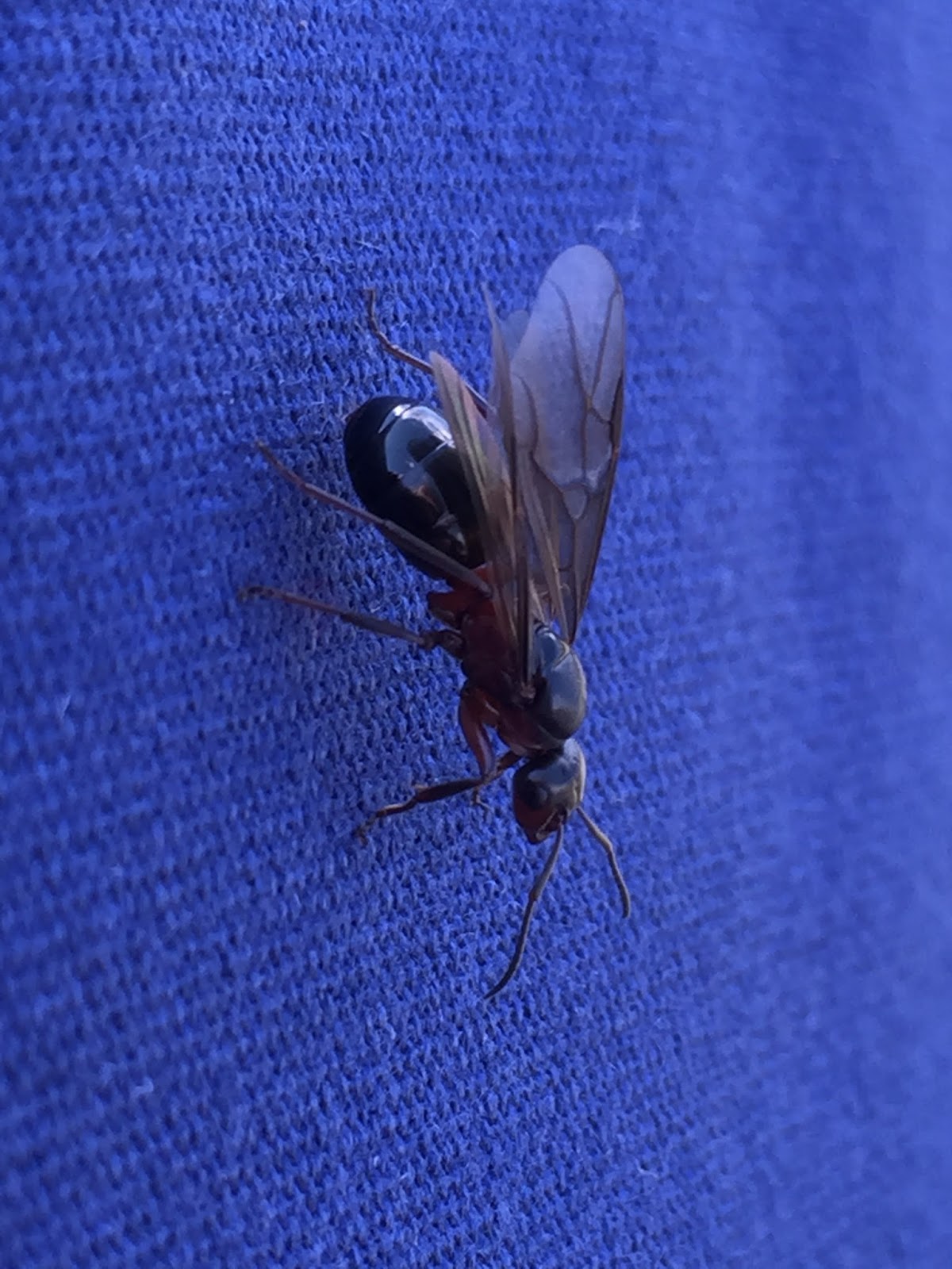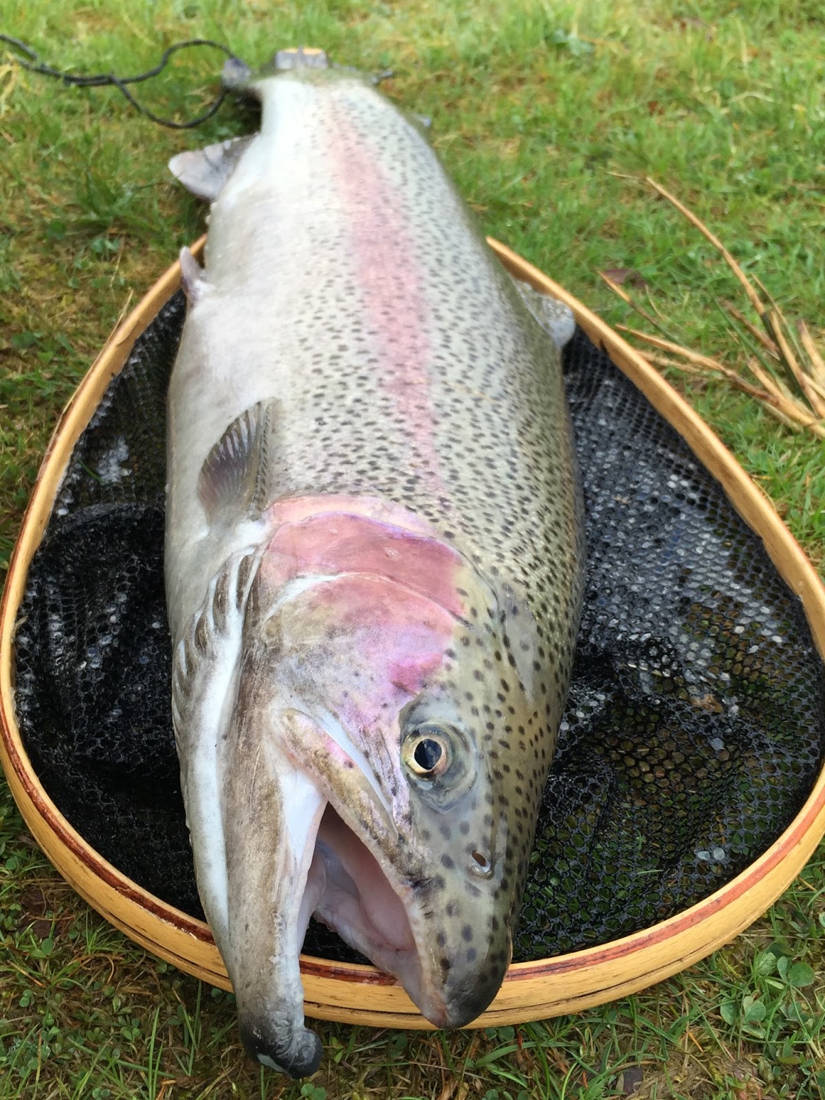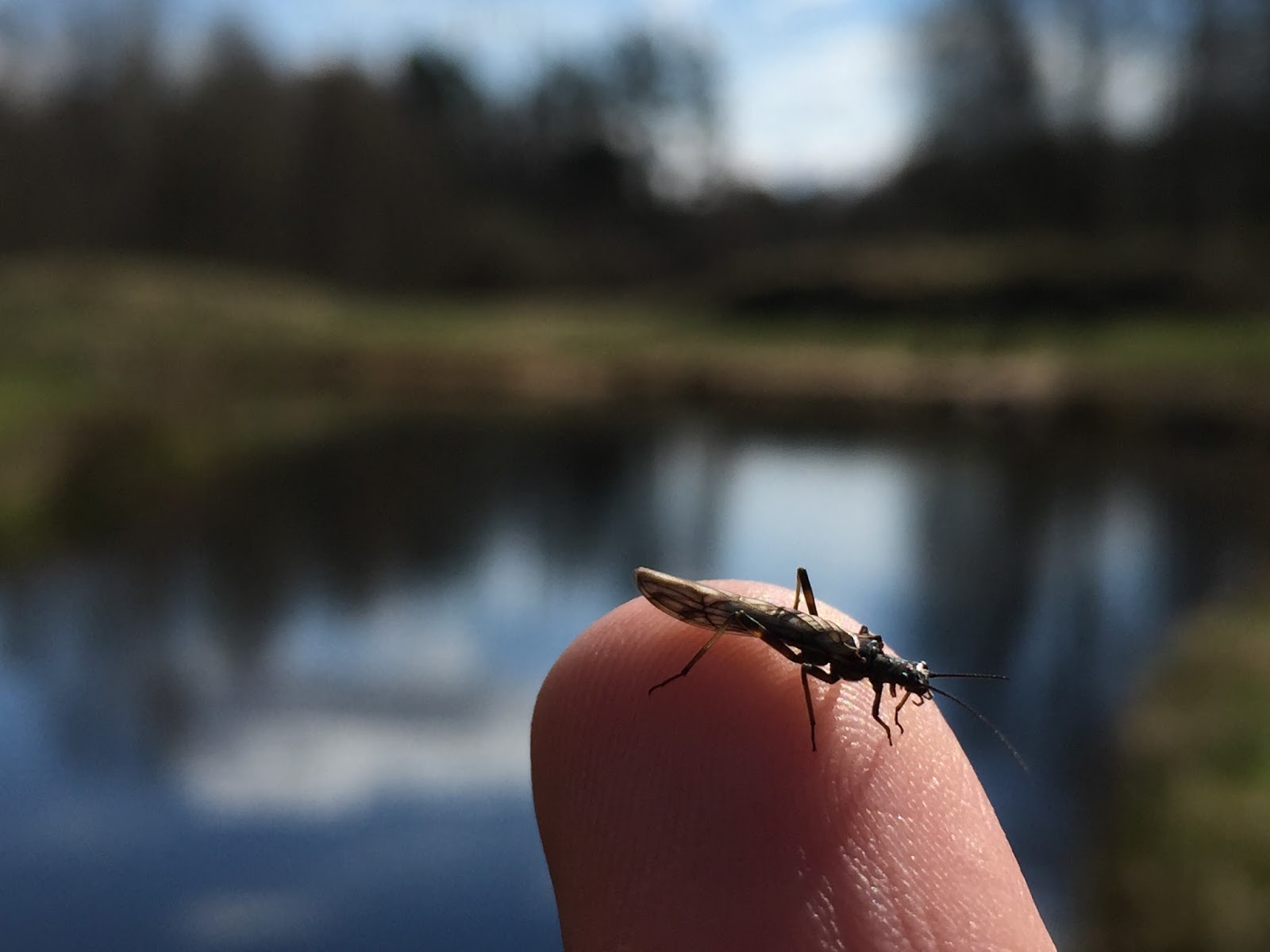 Vid Sunnedamm hade fiskarna börjat vaka så smått. Flygmyror plaskade hjälplöst runt i vattnet och i mina flugaskar hittade jag en lämplig imitation. Redan på första utlägget steg en fisk mot flugan, men avvek i sista stund. Kort därpå tog en annan fisk torrflugan i ett vackert head&tail-vak. Mothugget var resolut & vältajmat och efter en intensiv fight kunde dagens första regnbåge på torrfluga landas.