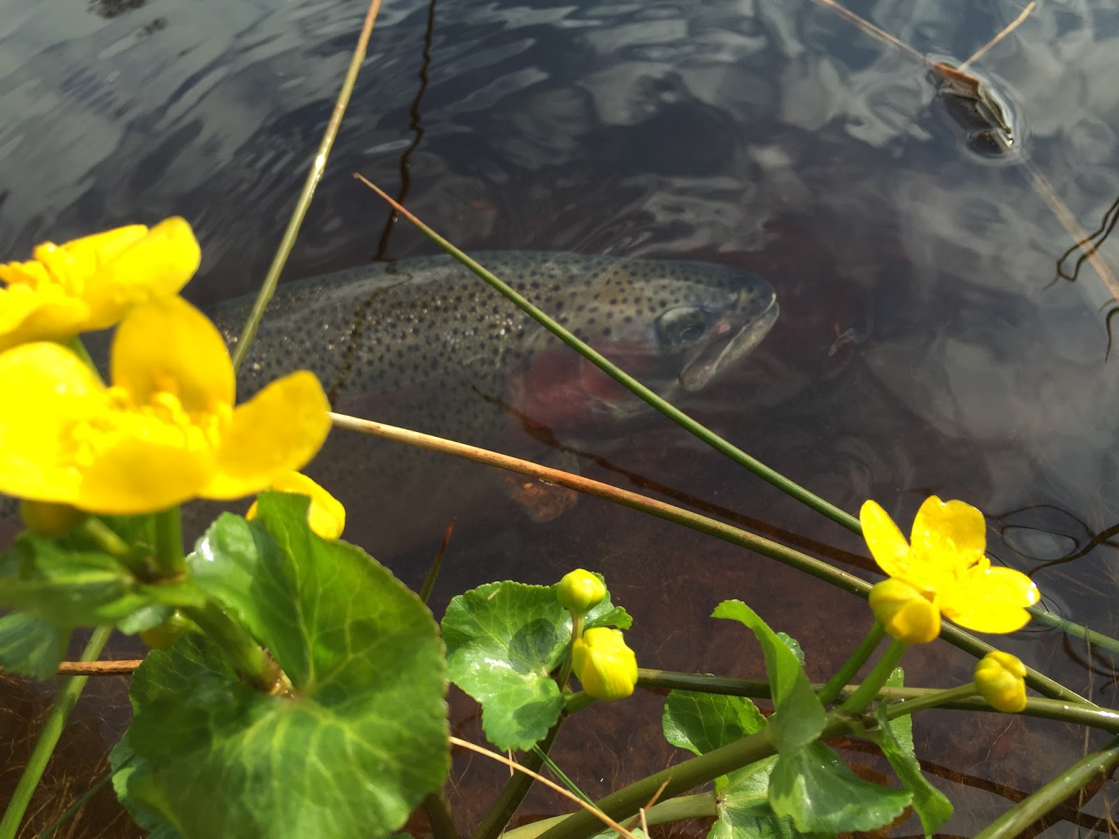 Fisket var av förklarliga skäl hyfsat svårt, men efter hand som solen värmde upp landskapet började kläckningarna och följaktligen även vaken. Små olivgröna dagsländor kläcktes sporadiskt under hela helgen och med egenbundna f-flys #16 landades fisk efter fisk. Flera gånger fick jag dessutom möjlighet att sightfiska på vakande regnbågar och att se stigningarna i slowmotion är verkligen en häftig upplevelse!