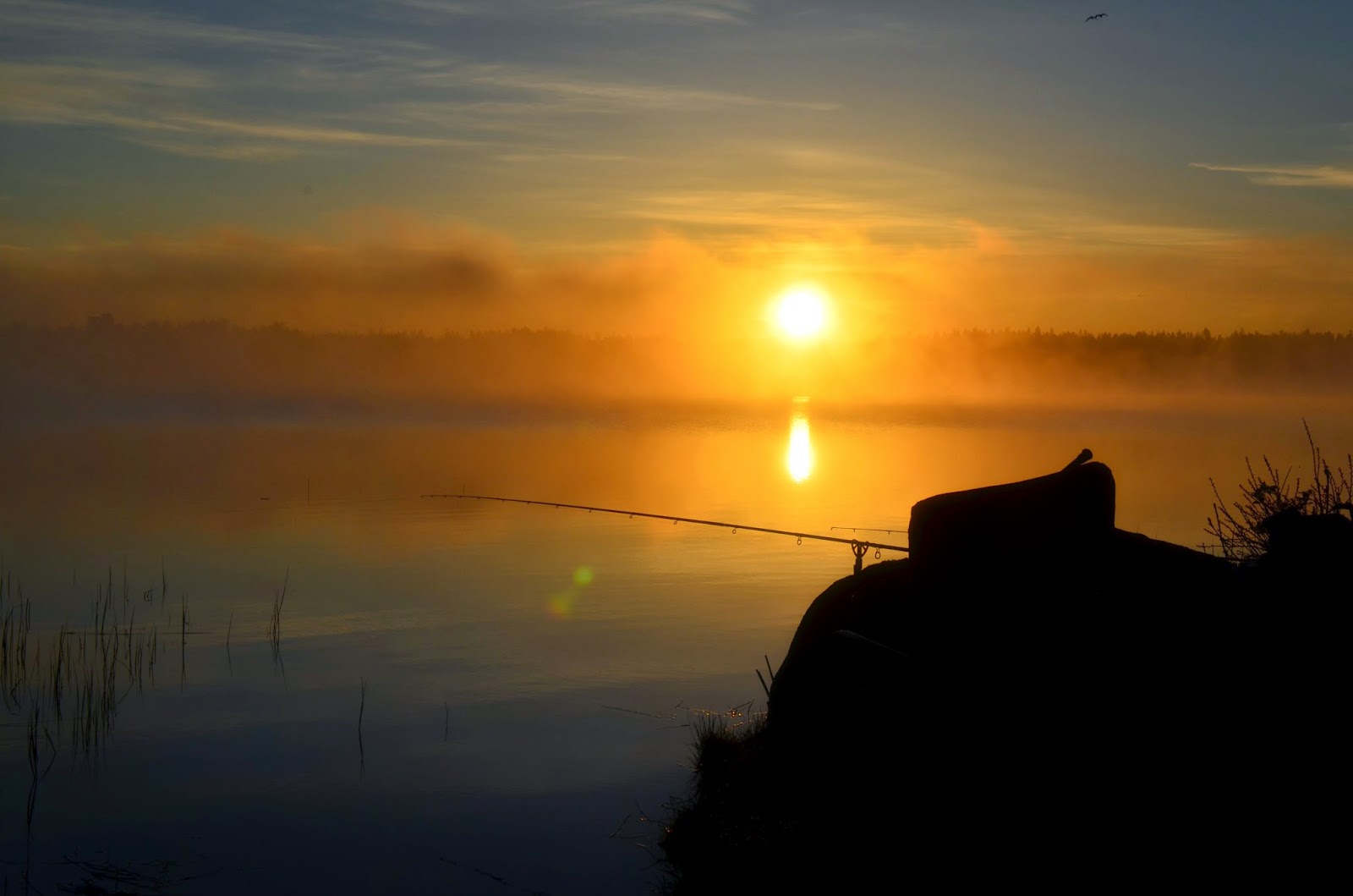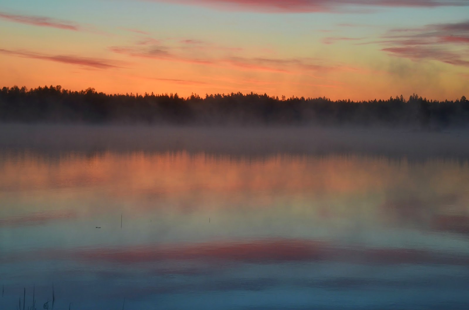 Framme vid sjön möts jag av en riktig vykortsvy, det är vid sådana tillfällen jag funderar på varför folk säger att man är galen, idiot, eller bara konstig som går upp mitt i natten för att fiska. Jag tänker istället att de är idioter som vill missa tillfällen som dessa. Jag tar fram kameran och knäpper av några bilder och skrattar lite för mig själv och tänker på alla stackare som ligger och sover, sen bär jag ner grejerna till sjön.