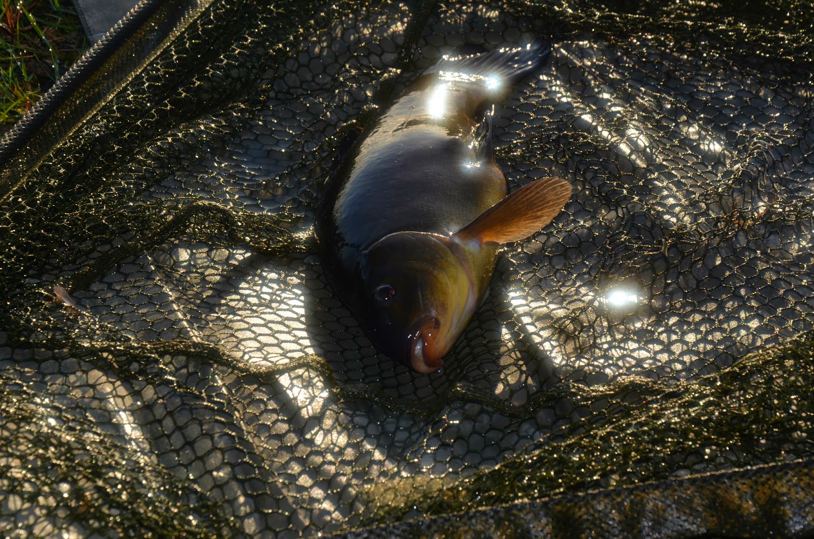 Båda spöna är snart ute igen och så får jag några pet på feederspöt, är på helspänn och snart böjer sig spöt ordentligt och fast fisk. Nu möts jag av bättre motstånd och fisken rusar rakt in mot vassen men lyckas styra ut den innan den hann gå fast och efter några turer till så ligger så äntligen årets första sutare i håven. Riktigt roligt och vilken fight den lilla skönheten bjöd på, och det nya feederspöt var helt perfekt till ändamålet! Kan varmt rekommendera Map Carptek 12ft Commercial Method Feeder Rod, finns hos Metebolaget för 599 kronor.