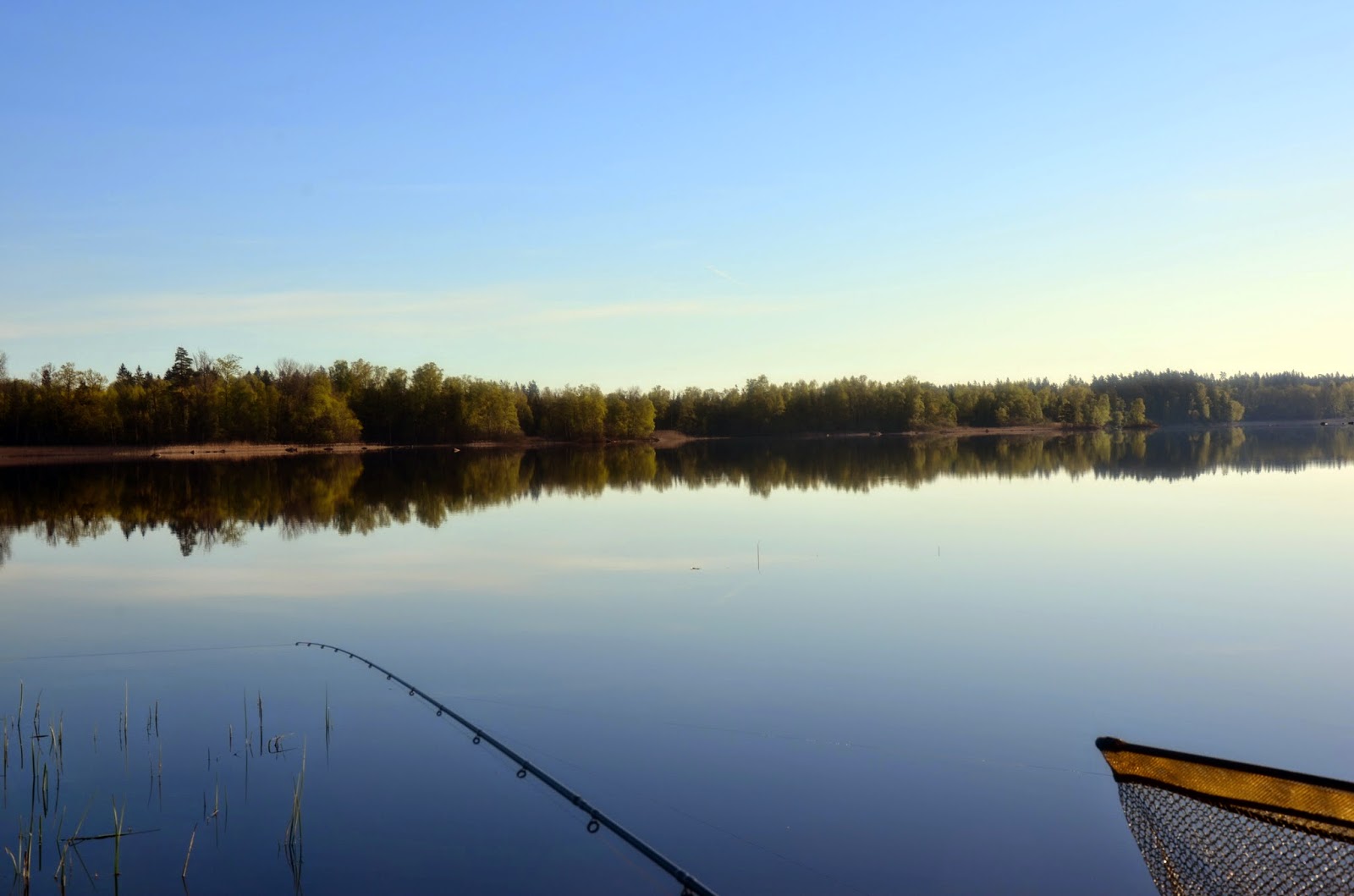Sjön låg vindstilla och solen hade letat sig upp en bit på himlen när det var dags att plocka ihop och åka hem igen. Men jag hoppas snart komma ut igen på lite fiske.