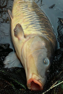 Jag tycker mig se en skugga i det gråa vattnet, lina knycker ett par gånger och dras ut och jag sätter kroken i årets första karp. Den är liten, men ger mig puls ändå, man vill ha den i håven.... alltid så de första gångerna man är ute, sen blir man lugn under resten av säsongen... eh!
