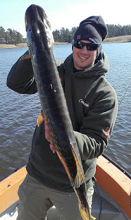 17/3, 7-14. Lite mera vind och milt växlande väder satte fart på fisken. Kändes hett direkt de första kasten och efter att Micke haft en rejäl virvel efter på första ankringen kan jag några kast senare nita dit en fin gädda tio meter från båten. Hon skakar och rister och bakre kroken sitter ytligt men håvningen sitter och vi kan pusta ut. Metern lång och 7,5kg på rödsvart Taggen från Gäddgapet gör nytt hemmapers.