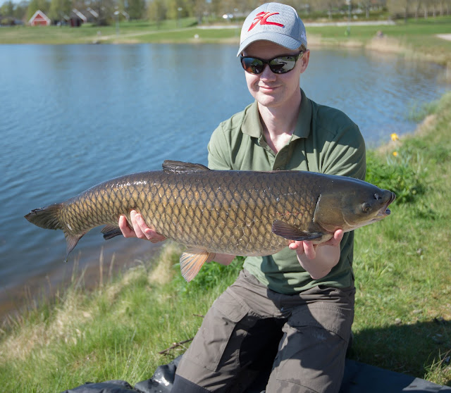 Mycket riktigt och det är inte ens en bifångst utan faktiskt en gräskarp. En lite mindre fisk men ändå rätt fisk. Det kändes riktigt bra att så tidigt på året fått en på första passet.