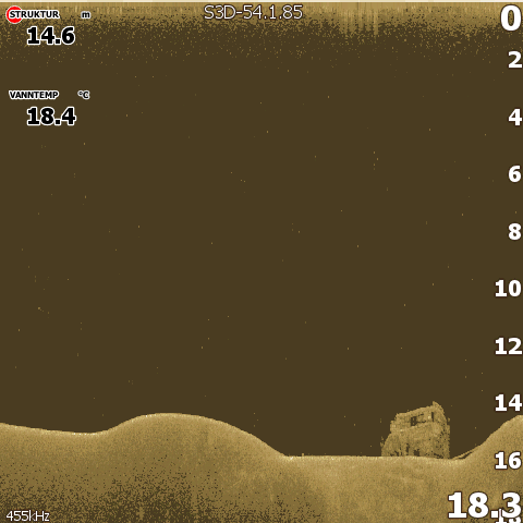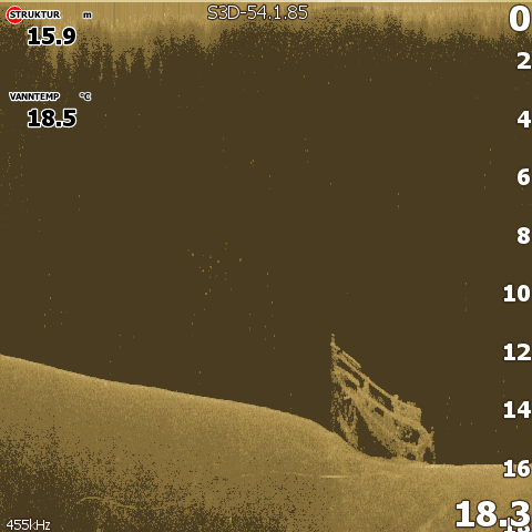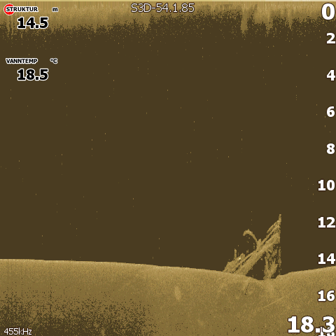 I'll throw in a screenshot from the HDS 5 Gen 2 using 2D-sonar as well. On the left side If the screen you see 200 kHz with its rather narrow coneangle of 11 degrees (measured at -3db), while the right side of the screen is 50 kHz with a whopping 45 degrees coneangle. (You can read the full spec of the P66 from Airmar HERE.) This screenshot clearly shows you how a narrow versus wide coneangle affects how your sonar reads and draws the bottom line. With 200 kHz the wreck clearly rizes from the bottom, while the wide coneangle of the 50 kHz makes it disapear in the bottom line. On 50 kJz we can only see a faint hint of the wreck since the bottom line thickens slightly where the wreck is, due to the wrecks harder return of the acoustic signal then the surrounding (softer) bottom.