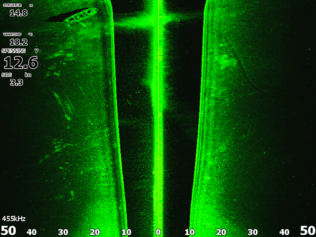 I then turn 90 degrees from my first couple of passes over the wreck, to look at it from another angle. Note what looks like disturbance on these shots. They where taken a couple of hours after my first attempt, and in the meantime a large school of what I think was small European Sprat had taken up the site as their new home. I could see them on the surface as well. It is kind of a problem of luxury when to much fish makes it harder to see with your sonar...