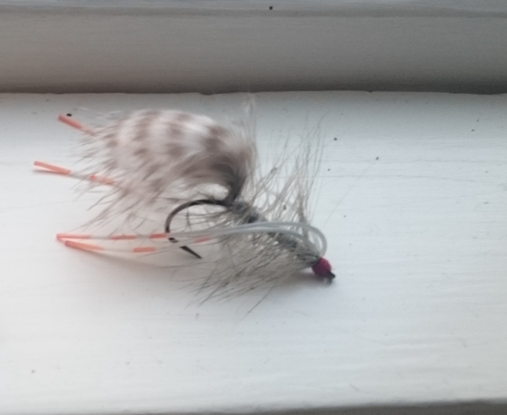 Nya vadarna och nya håven lägger lite grus i den väloljade fiskerobotens maskineri. Flugvalet gjordes redan i bilen. Flera dagars frånlandsvind innebär att vattnet är klarare än det bästa ramlösa någonsin producerats. Blir en naturlig fluga. Men det skumma ljuset gör att det behövs nånting extra. Lite orange. Designen är skamlöst snodd från HALster.
