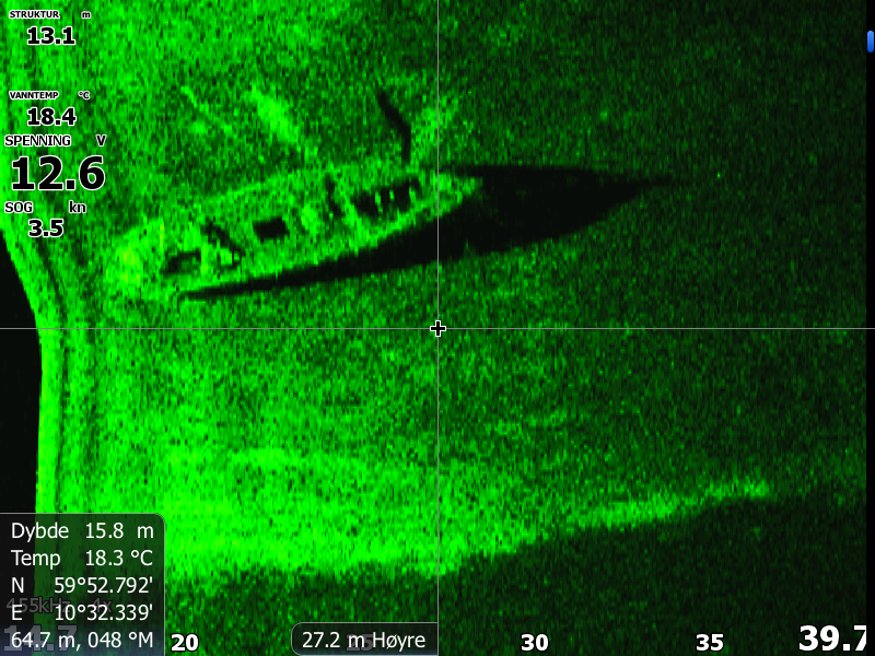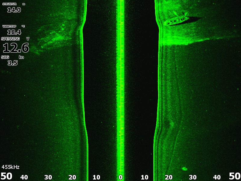 The first image in this article (the one with coneangles) was made from a sonarlog of SideScan. The same wreck as seen there and with Downscan, looks like this on SideScan: