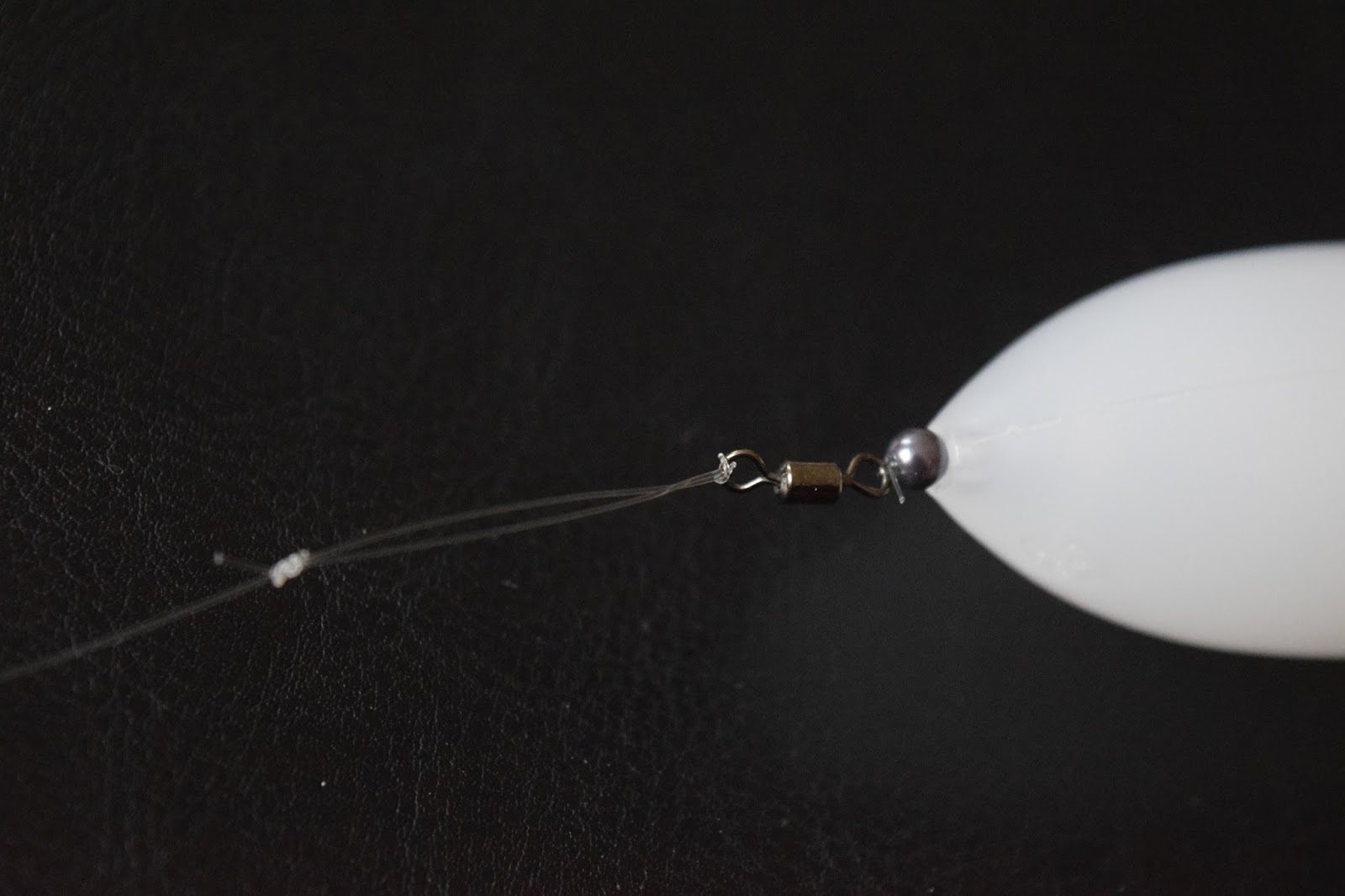 Här ser du hur du ska ha det när det ska vara glidande, din långa tafs med en loop i lekandet som är storlek 11, en 4 mm pärla och surfacekontrollern glider på huvudlinan, det blir inte enklare... Eh om fisken tillåter detta.