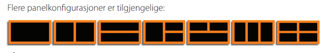 Oppløsningen er på 1920X1080, dvs full HD, men det må nesten til på en skjerm som er ca 40 cm diagonalt. Jeg er litt skuffet over mangelen på USB eller HDMI, Simrads største NSS har HDMI-ut. Dermed blir også denne artikkelen om HDS 16 Carbon kort, fordi det ikke er andre forskjeller mot dens mindre søsken enn størrelse og oppløsning. Vi får fylle på litt ved å vise de ulike panelkonfigurasjonene, med andre ord alternativene for å dele opp skjermen i ulike bilder:
