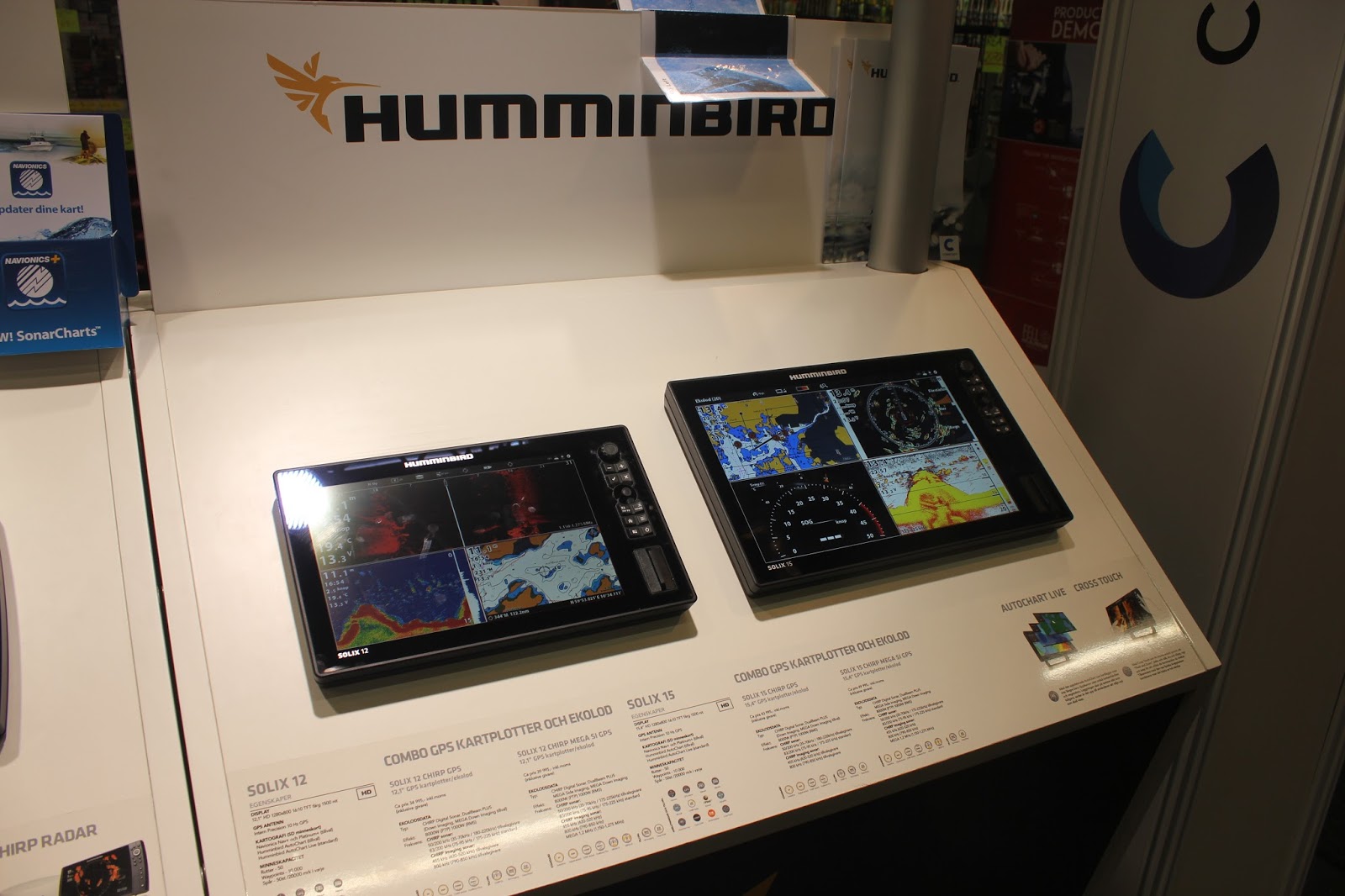 Humminbirds Solix kommer i en 15,4" som du kan lese mer om i DENNE artikkelen. Oppløsningen er 1280X800. Her er Solix 15 ved siden av "lillebror" Solix 12 under båtmessen i Gøteborg.