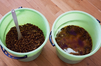 Det var väl inte så svårt och nu har du runt räknat ca 13 kilo färdiga Tigers för ditt fiske och både Karp och Gräskarp älskar dessa beten. Dock vill jag säga att ska du enbart fiska Karp, så rekommenderar jag dig att tillsätta chili innan blötläggningen, men ska du fiska Gräskarp, så håll dig från chillin och fiskar du i vatten med både Karp och Gräskarp, så skulle jag ha chiliflingor tillsatta.