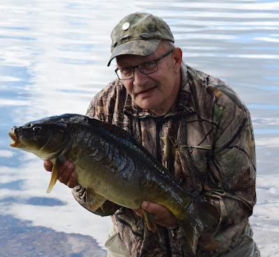 Gräskarpen står 2 meter från min rigg och hela stjärtfenan är över ytan och sen drar det i väg på min rigg och gräskarpen pyser och jag drillar denna spegel och får hjälp med bilden av en förbipasserande gubbe och det gick jo bra som synes och karpen satte ut igen.....