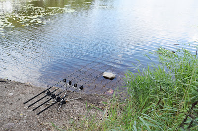 Jag började fisket vid middagstid och körde 4 spö med Tigers, 1 rigg längs en vasskant och resten ute bland näckrosorna. alla tigers stod som mindre staplar över kroken, balanserade med antingen faketigers från Enterprise eller med en liten korkbit.