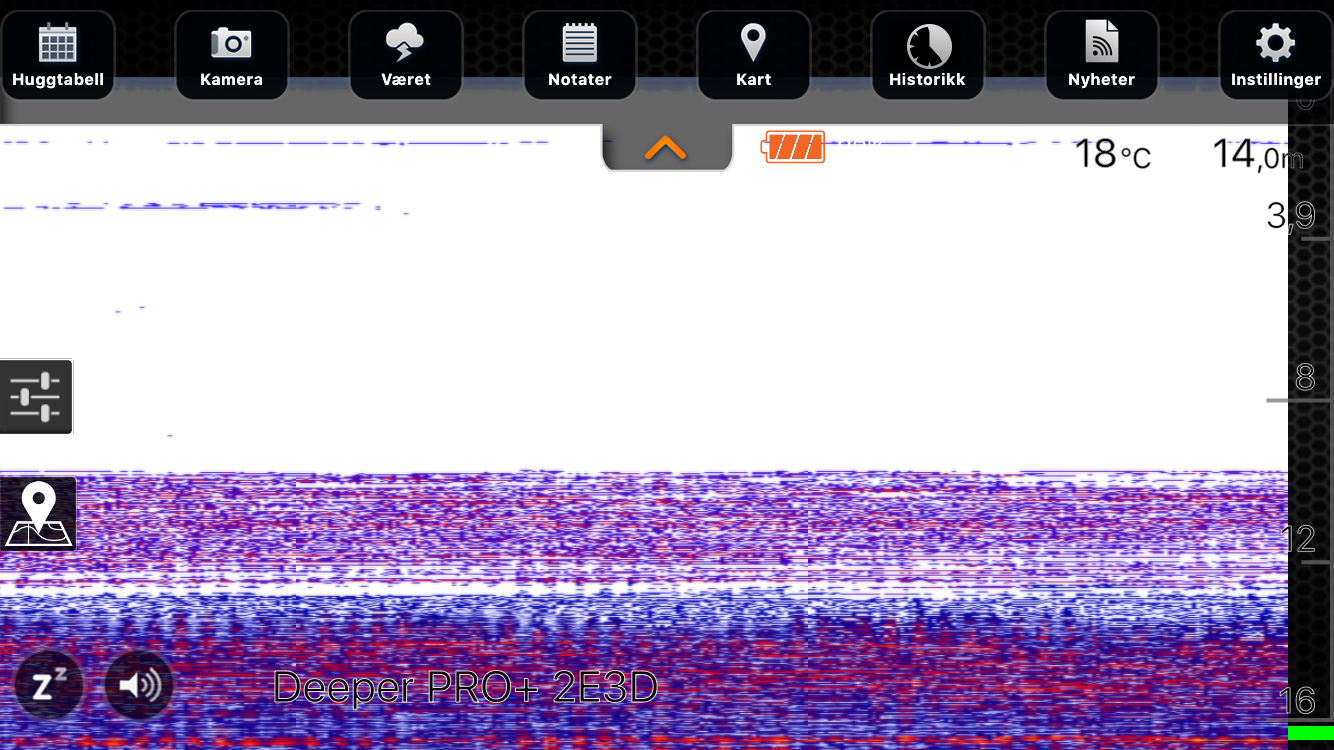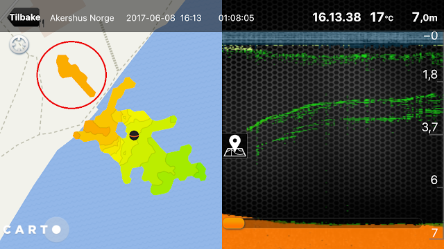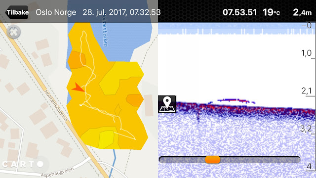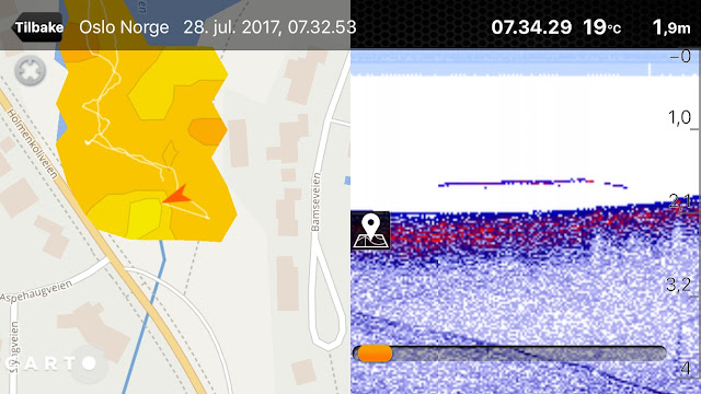 Before we start with a look at the technical bit, I have a confession to make. Personally I usually prefer more advanced (and pricy) sonar- and GPS-technology then Deeper and their main competitor Vexilar Sonarphone. I have tried both Deeper and Vexilar before, but mostly just for fun and not looked at them as serious alternatives to my other sonar-tech. However, I do see options like these as good options in their pricerange, and for their usage. It makes a lot of sense, that when looking at sonar in this pricerange, the user can get more bang for the buck by using a screen and processor their already have, and just complete that with a "sonarmodule". In our part of the world almost everyone has at least one smartphone or tablet already, many have more than one. It therefore seems like good sense that these users can get more for their coin by using what they already have. And as the screenshot with my Deeper Pro+ on IPhone 6 below shows, it does work: