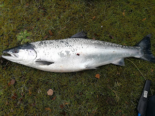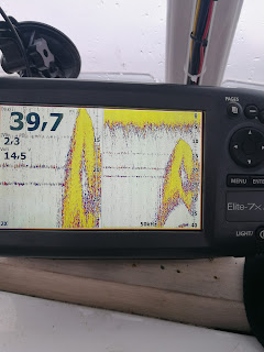 Sjösatte i Ystad o skulle gå 15nm sydost, men orkade inte stampa vidare i vågorna så vi stannade halvvägs. Ganska många fina bågar på ekolodet i början. Tog då en liten lax strax under måttet i ytan. Hittade sen några stora stim av betesfisk som vi körde runt ett par ggr utan resultat. Strax före lunch tog en ganska tam lax betet(hybriden-svenska flaggan) nere på 60 fot, en fenklippt 5-kilos som fick följa med hem. Avbröt vid 13.30 pga tilltaganda nordostan.