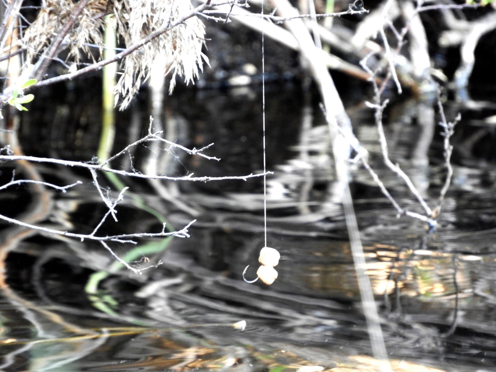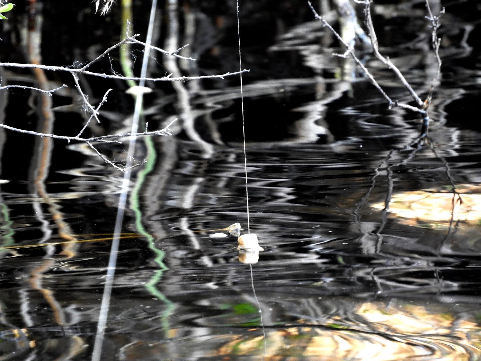 Ett bra kast och linan hamnade rätt och i kikaren såg jag att grenen var lagom tunn för att ge efter i mothugget. Ingen lina på ytan och nu kan man faktisk välja fisk! Det sker genom att man drar upp beten, när den lilla kom och har det kvar när den större var framme.