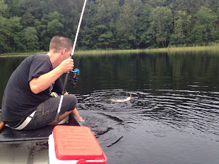 Trots att det inte blev jättemycket fiskat så fångade Calle 10 gäddor 2kg x2, 1,5kg x2, 1,0kg x 6 och 5 abborrar samt 1 mört och 1 sarv mellan kaffepaus och strandhugg samt underskön paddling.