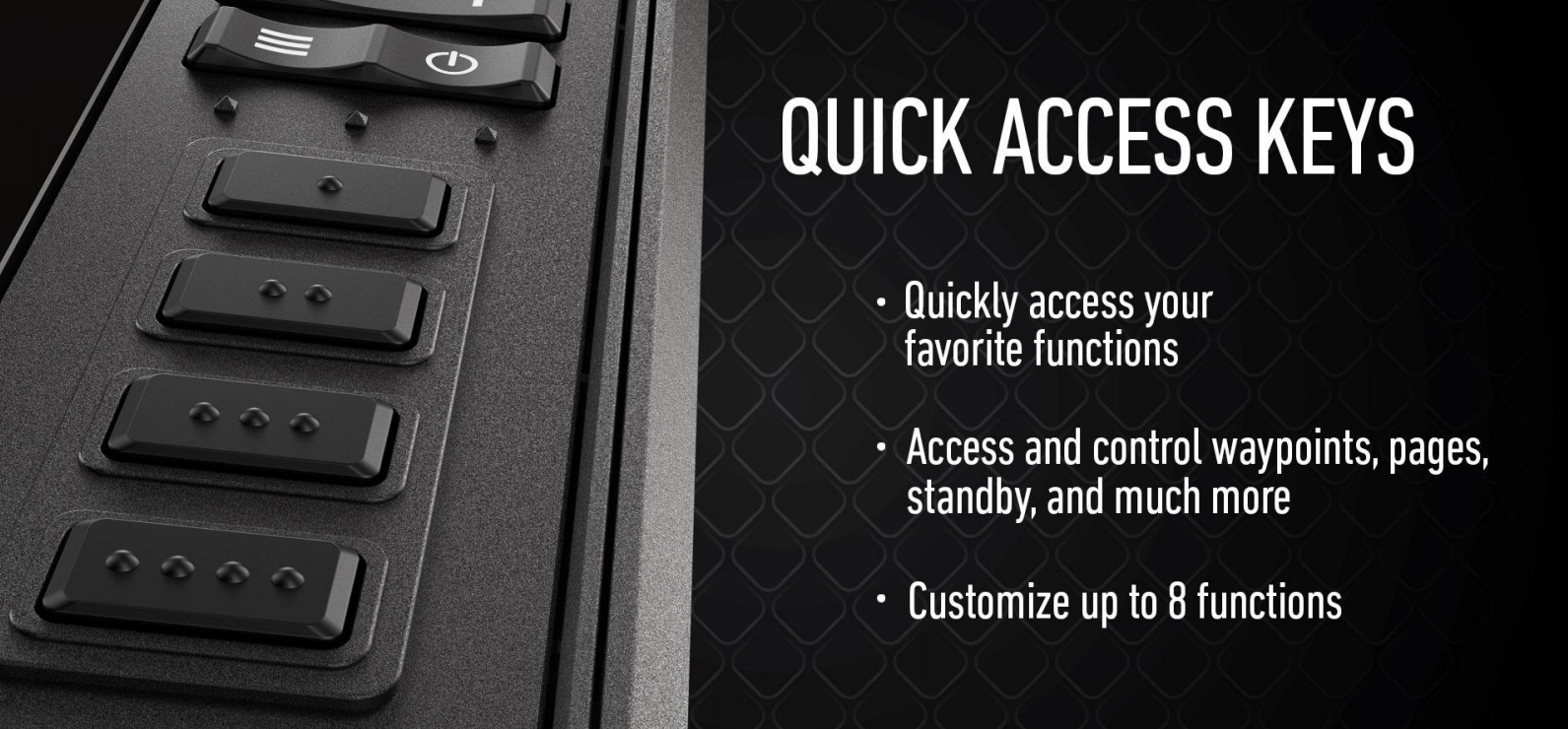 De av oss som har hengt med Lowrance en stund husker sikkert de programmerbare knappene i underkant av skjermen på HDS Gen 1/ Gen 2 i 8 og 10. Det er tydeligvis flere enn undertegnede som har savnet disse, for nå gjør de comeback på HDS Live. Disse fire knappene er dessverre bare på de to største størrelsene (12 og 16), men er programmerbare slik at du kan legge dine favorittfunksjoner mot disse knappene i steden for å gå via menyen. Du kan for eksempel programmere de til å sette waypoint med ett bestemt symbol, eller aktivere ankringsfunksjonen på den frontmonterte elmotoren din, eller sette enheten i standby (som er veldig praktisk hvis den er montert i front av båten.) Vi hadde veldig gjerne sett at disse hurtigknappene kom på 7 og 9 også, for de er svært anvendelige for en sportsfisker som bruker båtens elektronikk aktivt.
