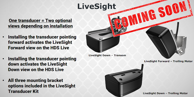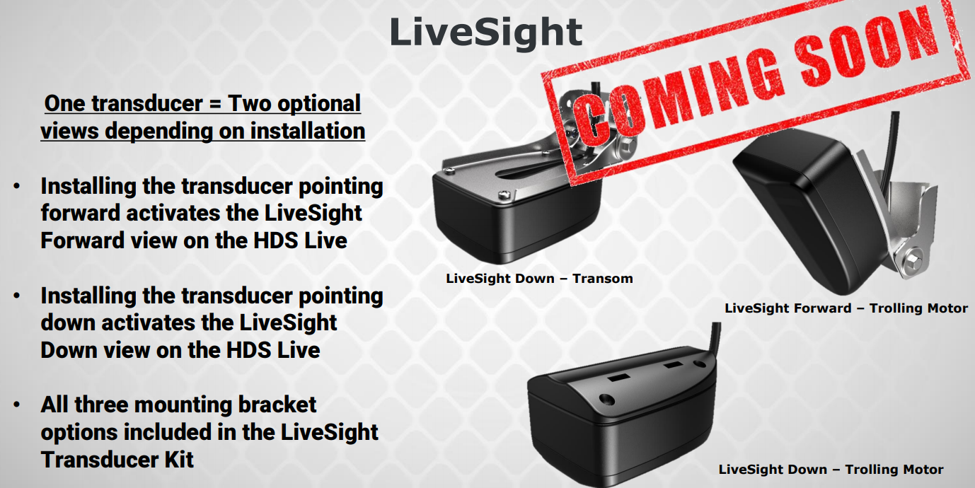 Så er det på tide å ta en kikk på den kanskje største nyheten forbundet med HDS Live, nemlig LiveSight. LiveSight er naturligvis et svar på Garmins Panoptix LiveScope, men selv om praktisk funksjon har mange likheter er det tilsynelatende flere tekniske forskjeller å spore utifra den høyst sparsommelige informasjonen vi har fått så langt.
