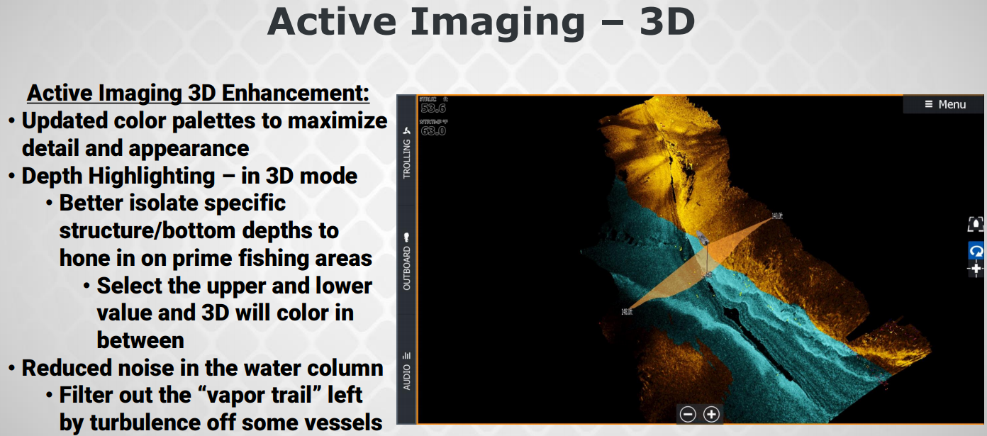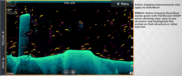 LSS-2 erstattes med "000-14490-000 Active Imaging Transducer" og TotalScan erstattes med "000-14889-001 Active Imaging 3-in-1 Transducer". Begge disse kan brukes med 455 og 800 kHz i motsetning til Structurescan 3D som bare kan brukes med 455 kHz. De første offisielle bildene med de nye giverne er imponerende, rekkevidden versus dybde er på høyde med StructureScan 3D mens oppløsningen er enda ett hakk bedre på kort hold: