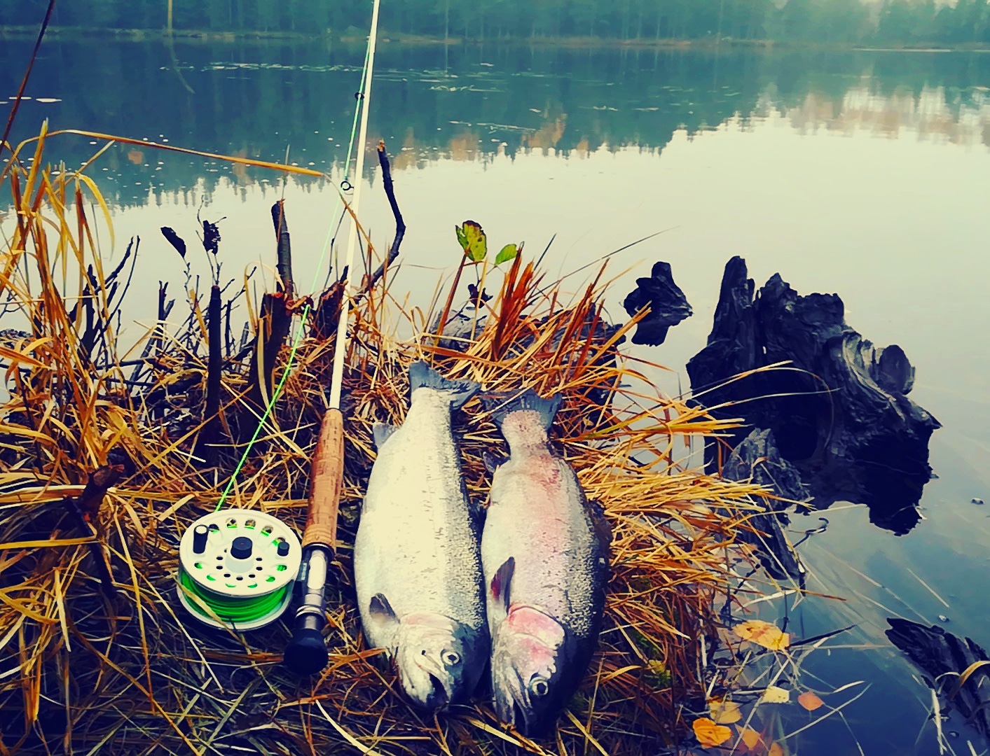 Regnbågarna fortsätter hugga grunt på våra flugor. Ingen jätteaktivitet imorse, fyra landade ihop för mig & farsan, men ett gäng fina tappade också så godkänt tycker jag. Nu är hösten verkligen här med disiga morgnar.